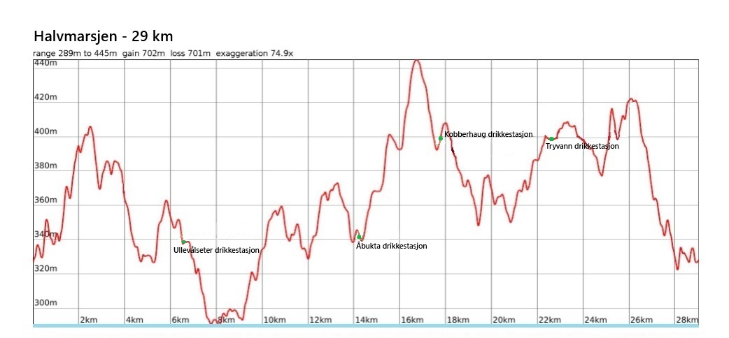 Høydeprofil med drikkestasjoner Halvmarsjen 29 km.