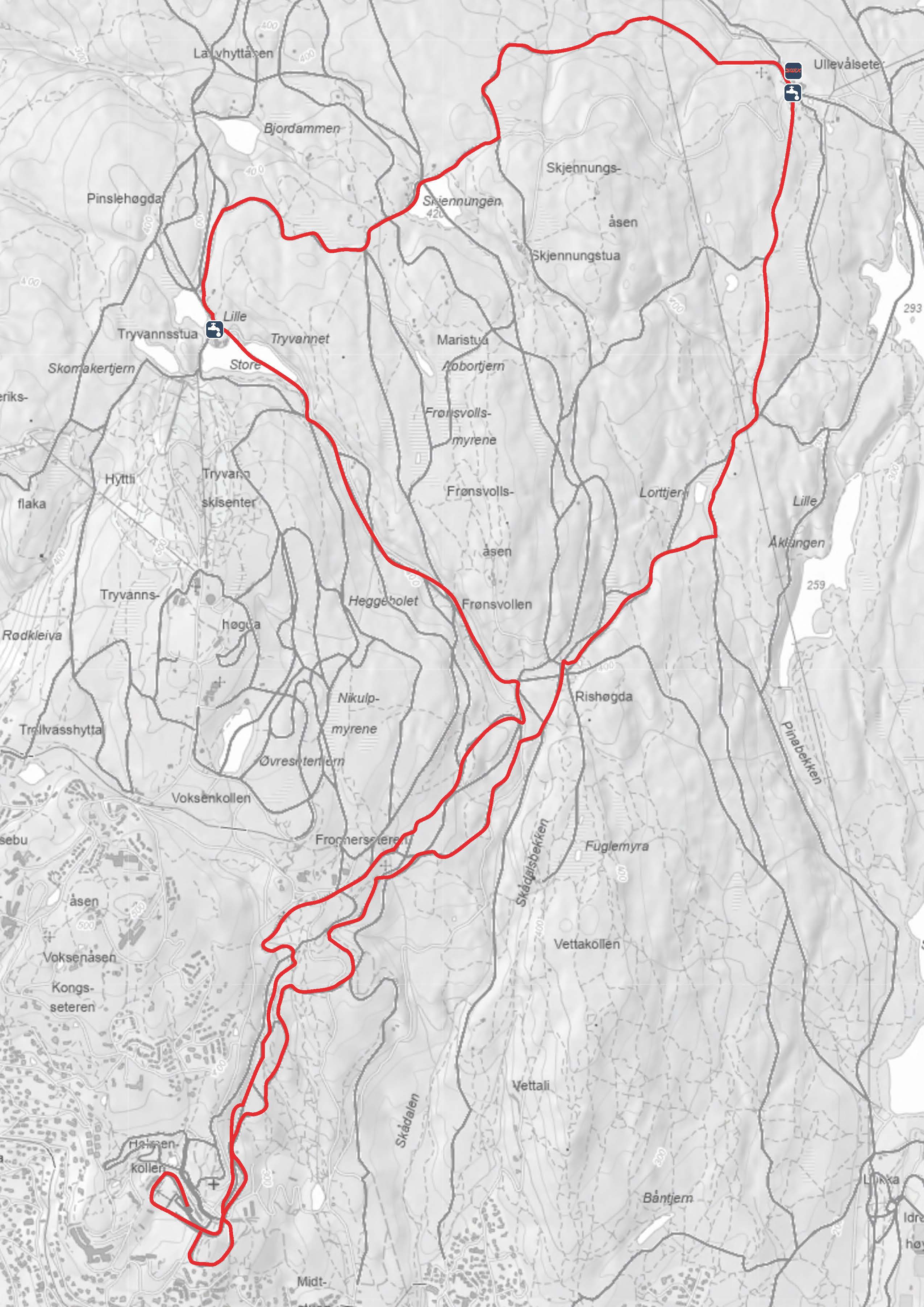 Traséen ut fra Holmenkollen er den samme som benyttes under World Cup – og heller ikke her får du noen enkel start. Det er nærmere 100 høydemeter fordelt på 1,5 kilometer, så det lønner seg å holde litt igjen i starten. I Holmenkollen går du på kunstsnø, som ofte oppleves annerledes enn natursnøen lenger inne i Marka. Nedenfor Frognerseteren fortsetter løypa inn på den gamle 5-mils-traséen. Ved Ullevålseter, etter drøyt sju kilometer, ligger løypas første drikkestasjon.