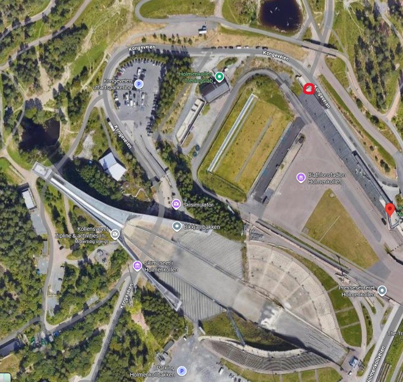 Veibeskrivelse: Kjør mot Holmenkollen nasjonalanlegg. Ta til venstre ca 300 m ovenfor Holmenkollen restaurant. Følg veien mot hoppbakken. Kjør gjennom tunnelen under hopptårnet. Parker på p-plassen du får på høyre side etter tunnelen. Deretter er det 2 min å gå ned til Kongestatuen.