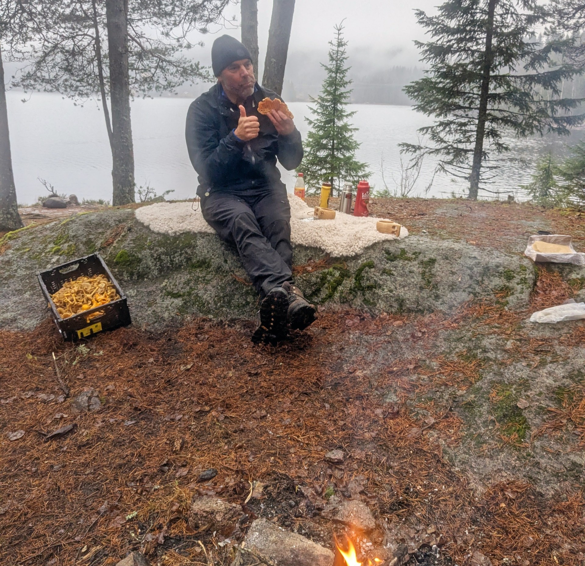 Bål og vaffel: Det siste har Micke lært seg å spise kald, og undret seg en smule i starten. Men det funker, mener han nå. Foto: Privat