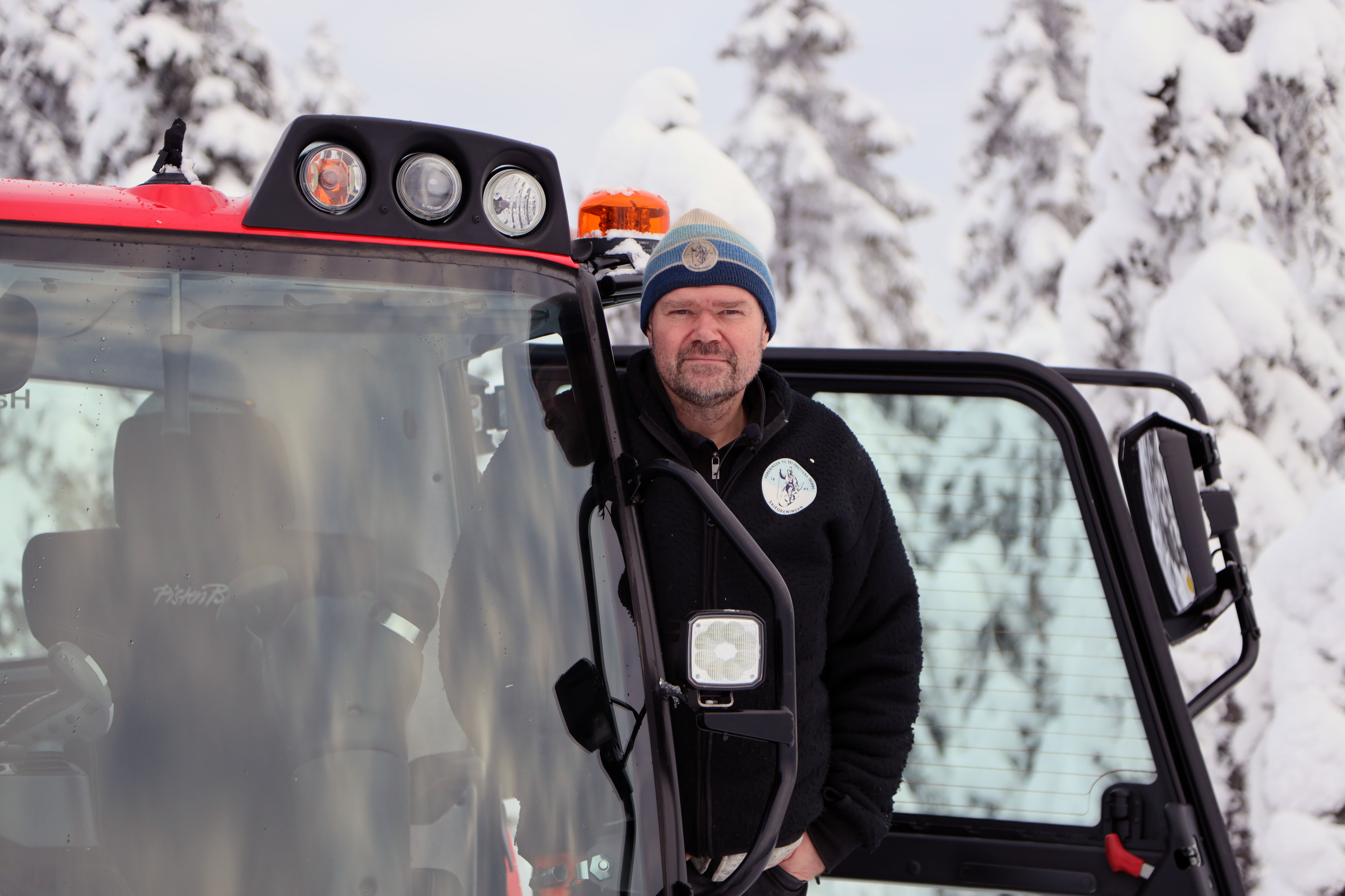 Det er 10 minusgrader ute, men inne i løypemaskinen er det behagelig temperatur. Han taster iherdig på telefonen for å skrive inn siste nytt om skiløypene i føremeldingstjenesten.