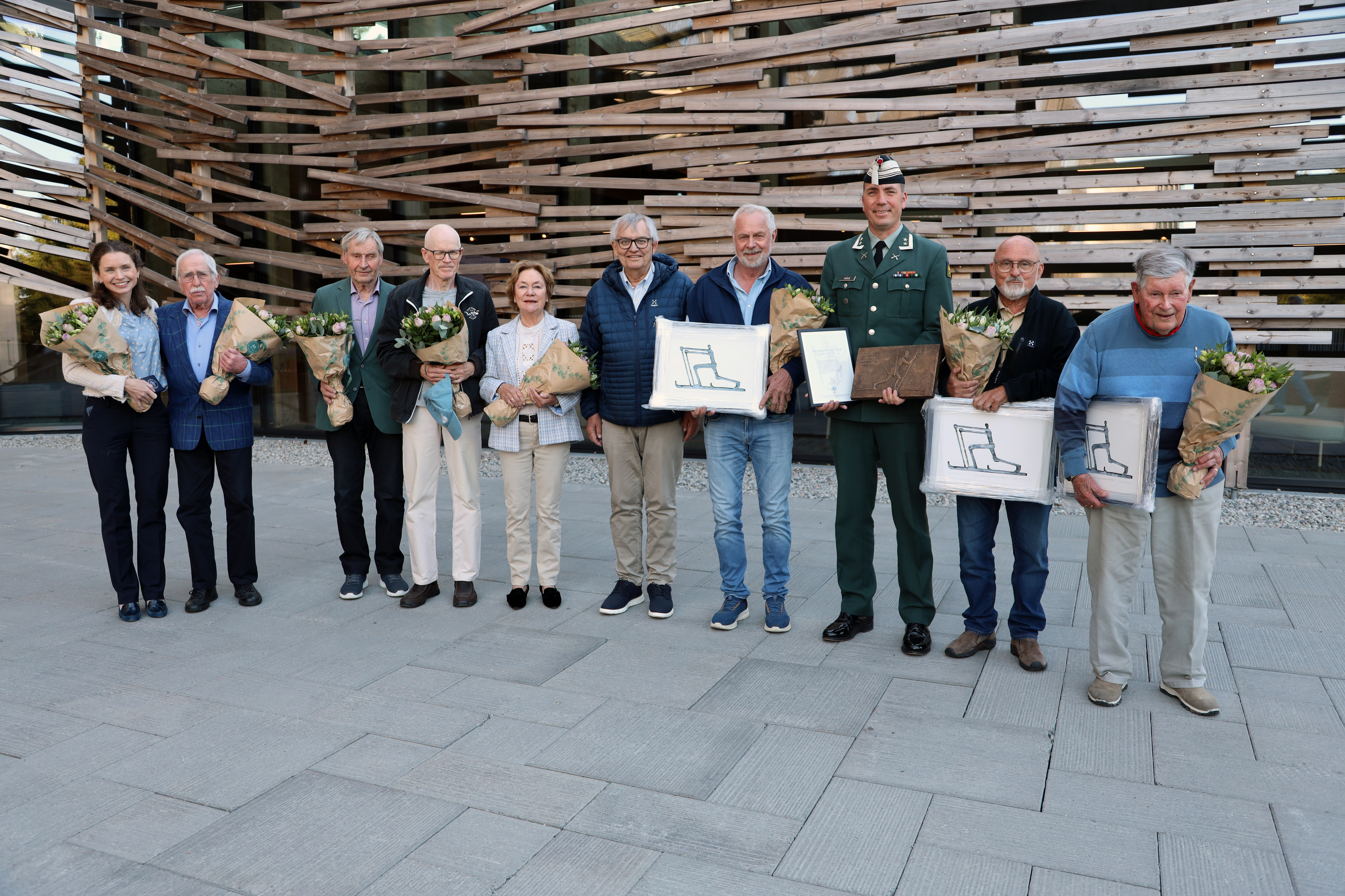 Disse mottok hedersbevisninger: Fra venstre Bodil Kristine Høstmælingen, Ragnar Skaarer, Karl-Olaf Løkenhagen, Terje Kilstad, Marit Tenvig Andersen, Stein Hroar Andersen, Trygve Rud, Henrik Hove, Frank Bergstrøm og Lars Rivö.