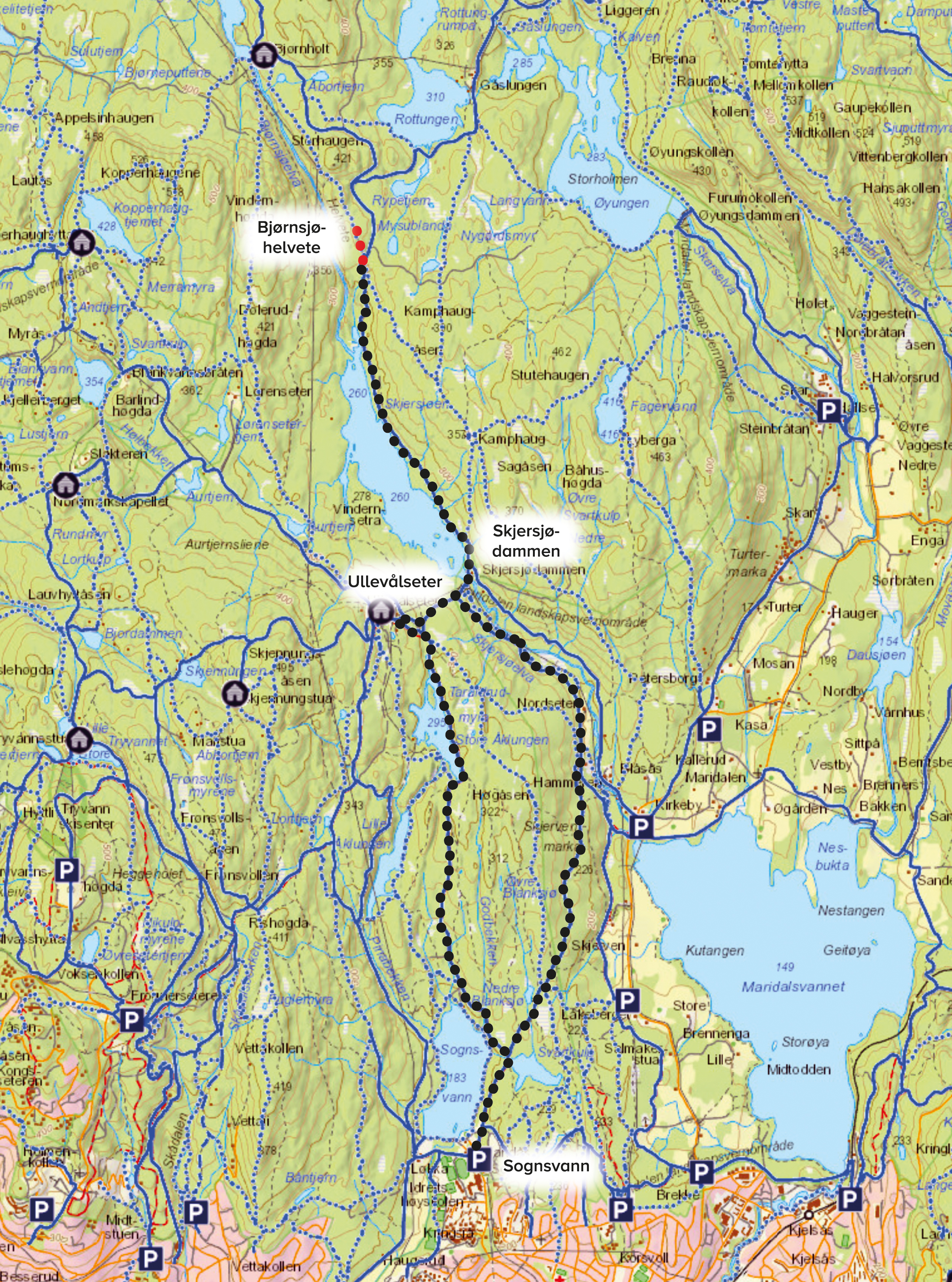 Når du nærmer deg Skjærsjøen, tar du ned til høyre mot demningen. Det er ikke så godt skiltet når man kommer nedenfra Hammeren, så følg med på en vei ned til høyre før den lange, bratte bakken starter oppover i retning Ullevålseter.