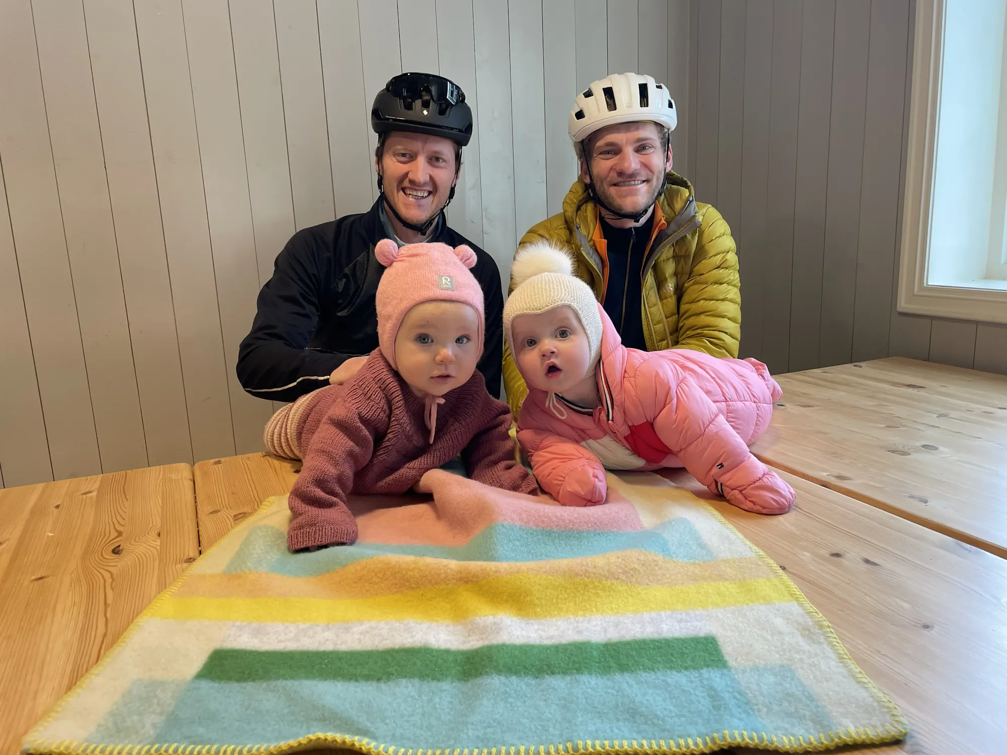 Hanna og Ingrid på Kikut i høst, med ankost pr. sykkel. Trilleturer i vogn er planen når de blir litt vassere til å sitte.