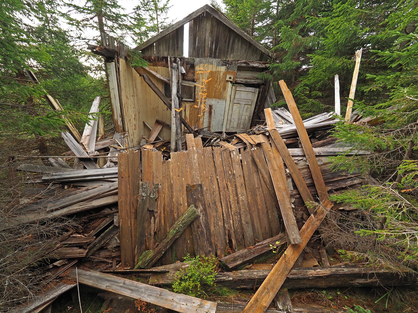 Nå hadde nordveggen rast videre innover inn i hytta og panelet hadde knekt. Det var tydelig at hytta ikke hadde hatt vanlig reisverk, men liggende stokker stablet over hverandre. Disse var ikke skikkelig laftet eller forbundet med hverandre i hjørnene. Endeveggen med inngangsdøra var fortsatt i ganske god stand, men den var nå nesten helt dekket av granskog. Her har det vokst bra til i løpet av ni år, og dette var siste gang det var mulig å ta et bilde av sydveggen.