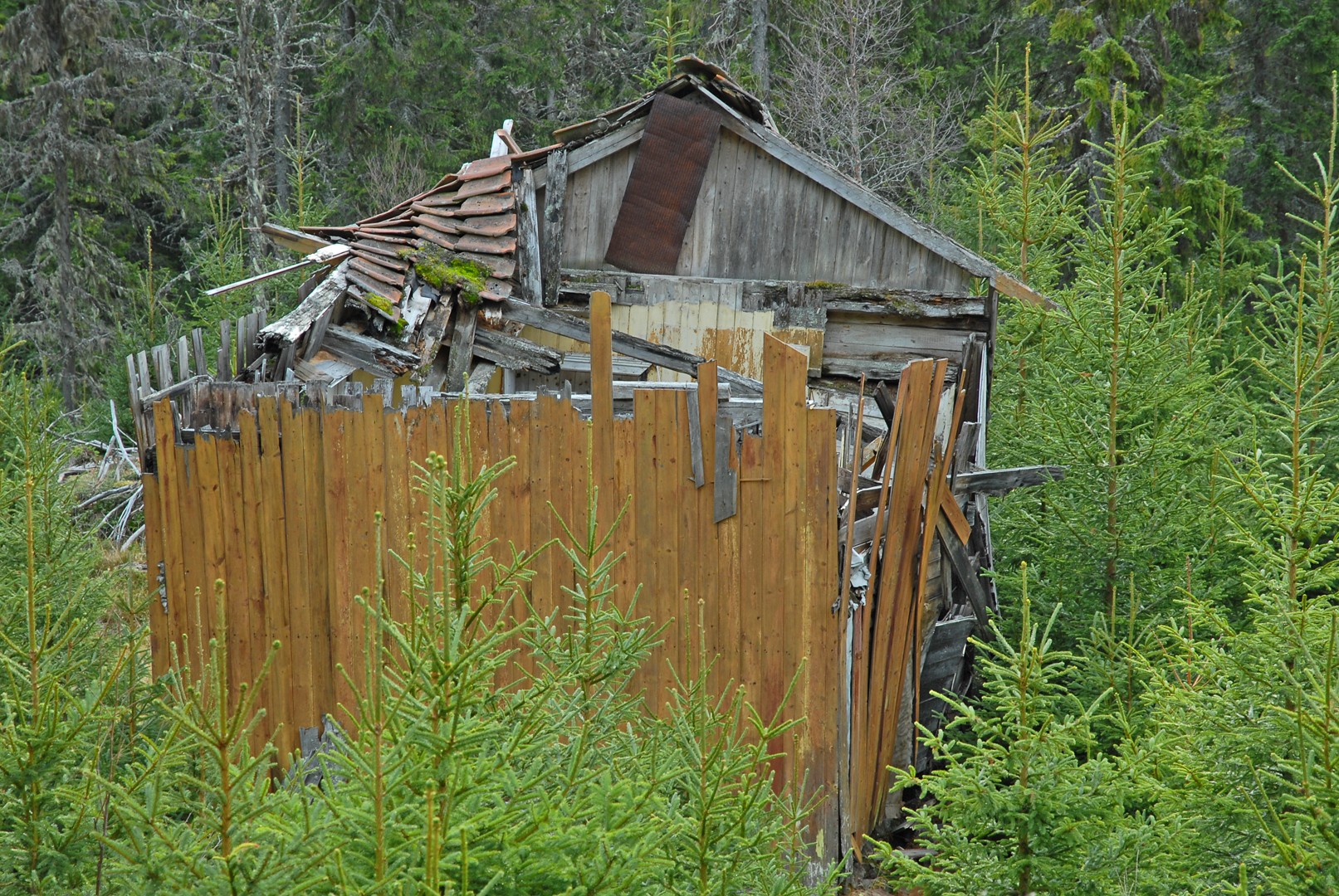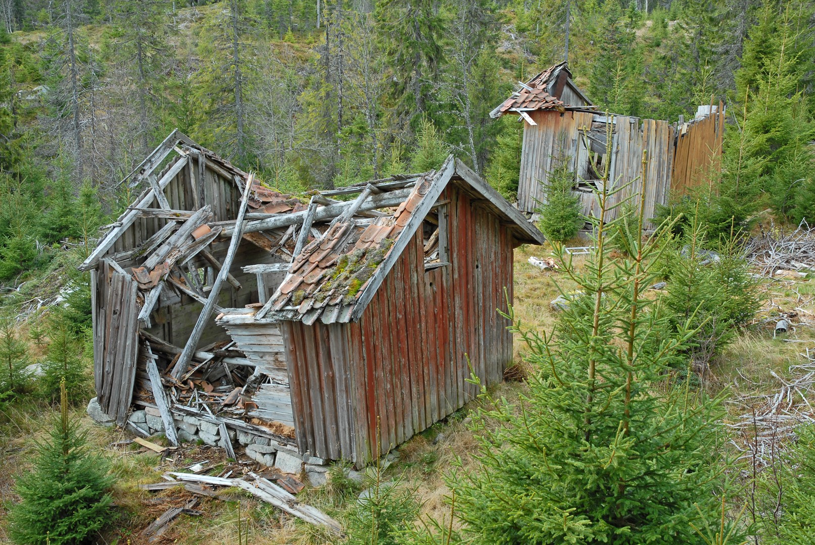 Ti år har gått siden første bilde av plassen (tittelbildet) ble tatt. Granene I plantefeltet har vokst både i høyde og vidde, og bygningene har rast enda mer sammen. Dette var det beste forsøket på å ta et bilde fra samme sted som i 2008. Selv med ekstrem vidvinkelzoom med en brennvidde som tilsvarer 14 mm på fullformat var det ikke mulig å få med hele bygningene.