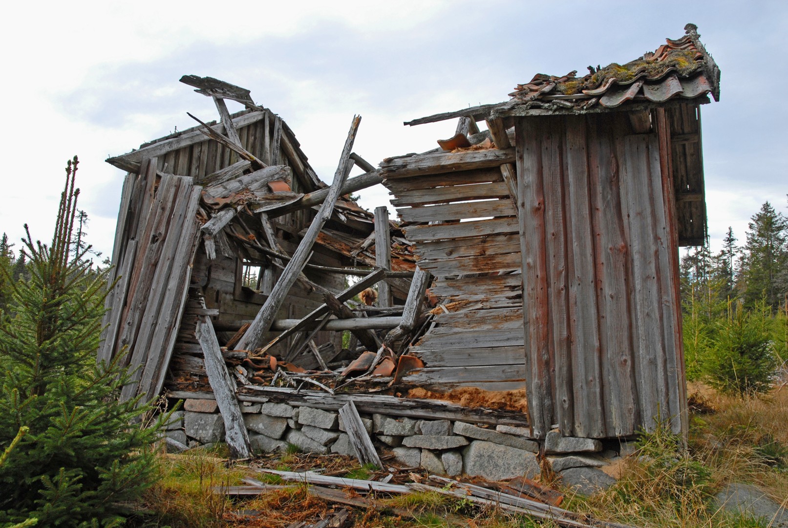 SNØENS HERJINGER: Snøvinteren 2018 har herjet kraftig med hovedhuset. Endeveggen mot nord har knekt fullstendig sammen og falt inn i huset, og begge langveggen har derfor blitt fri til å falle utover. Endeveggen mot syd holder seg fortsatt bra oppreist, gjerne på grunn av den stabiliserende virkningen av den forholdsvis stive doble inngangsdøra, som fortsatt er låst på plass.