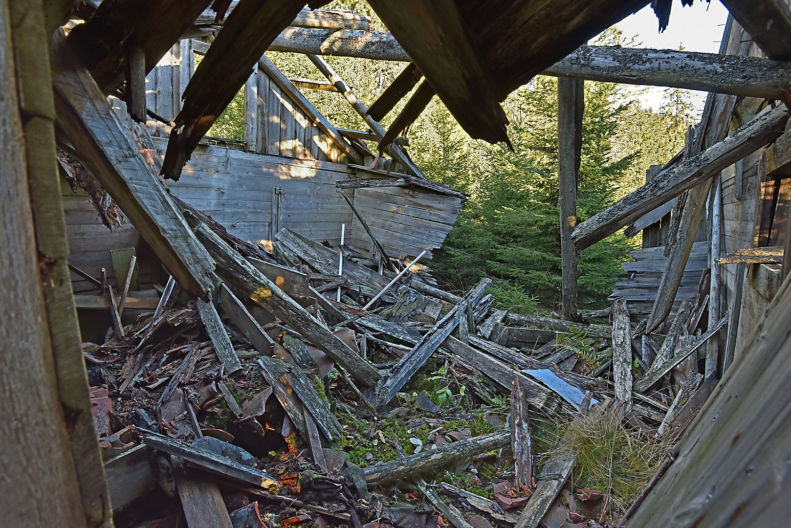Uthuset hadde nå rast enda mer sammen. Sett gjennom inngangsdøra var det et herlig rot der inne, hvor nedraste materialer sammen med ovn og andre gjenstander fra våningshuset var bare røyset sammen.
