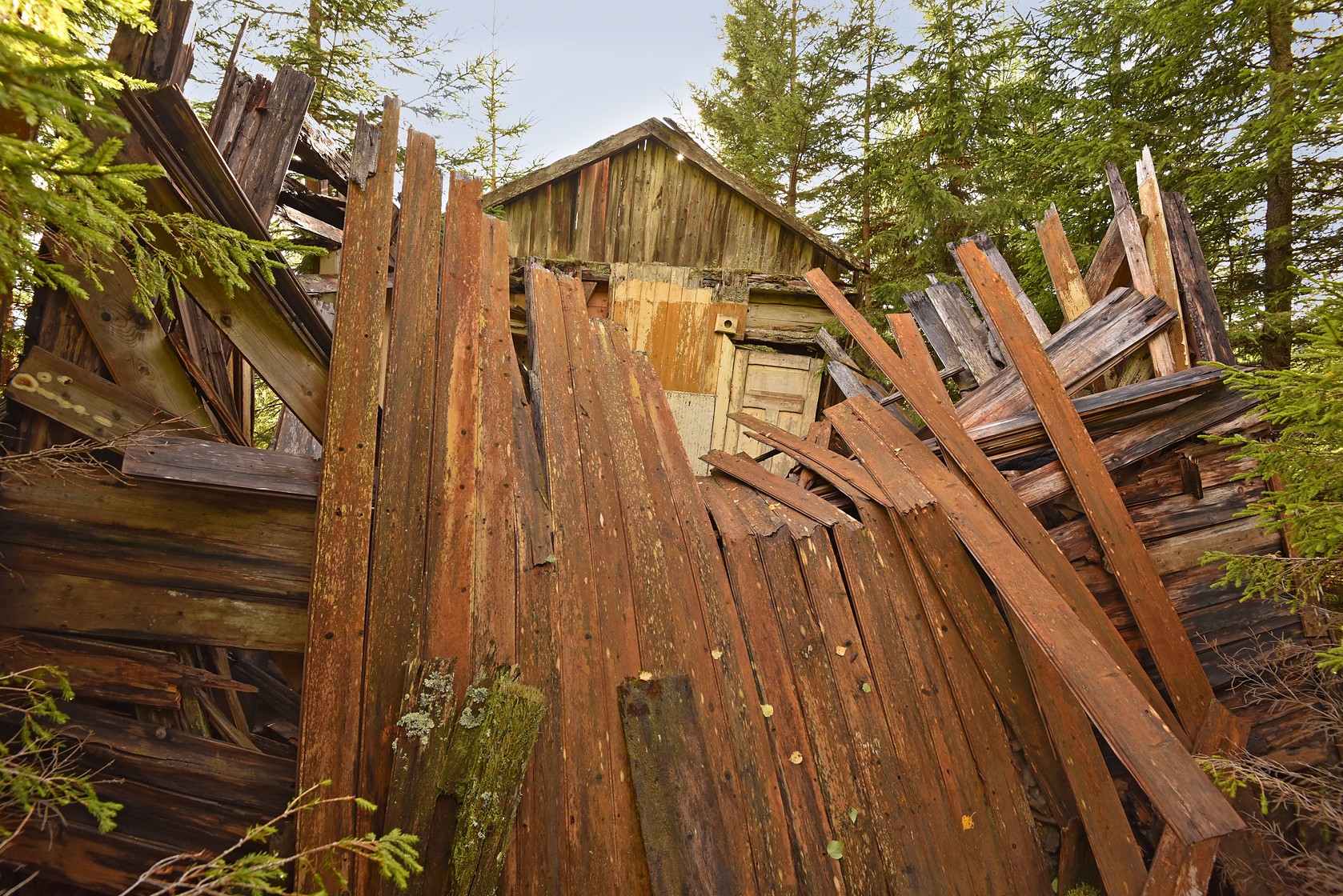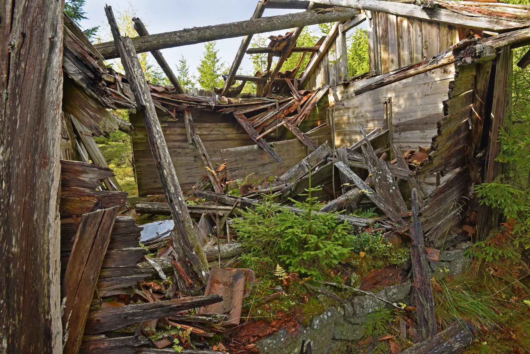 UTEN REISVERK: Det utvendige panelet på nordveggen hadde nå (2017) knekt, og veggen hadde rast innover i huset. Bildet viser også tydelig at huset ikke hadde noe vanlig reisverk, men liggende planker. Disse er tydeligvis ikke felt sammen i hjørnene, og heller ikke skikkelig forankret til plankene i langveggene. Det er også tydelig at det var en dobbel inngangsdør, vanlig dør med varadør utenpå. Det er muligens en brannisolerende plate ved siden av døren, slik at ovnen sto der. Det er ikke mulig eller forsvarlig å komme inn og undersøke dette nærmere.