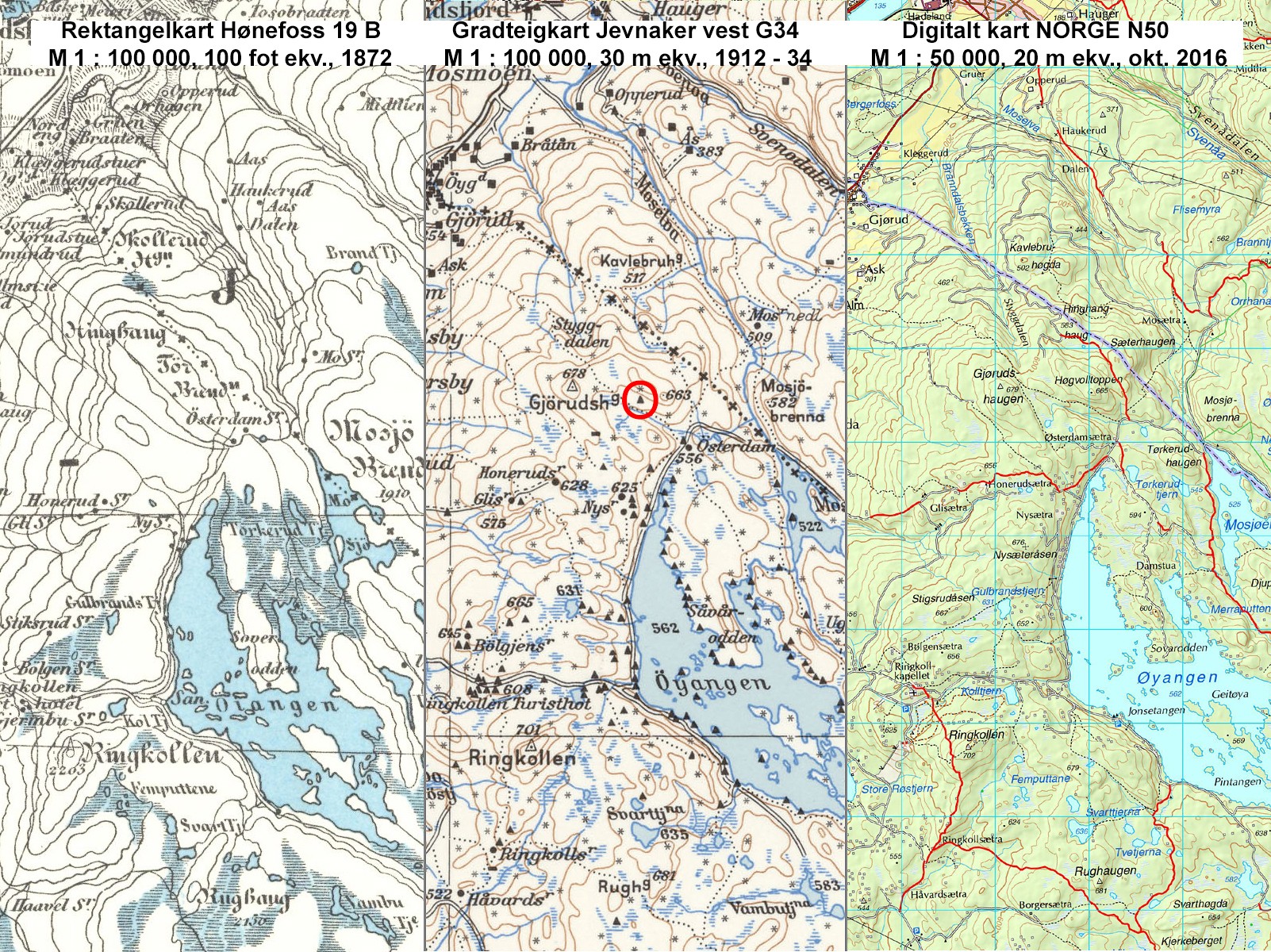 Bildet viser omtrent samme utsnitt av Høgvolltoppen og området rundt den med rektangelkart opprinnelig fra 1872, veier revidert 1939, gradteigkart opprinnelig konstruert i tiden 1912. – 1934, og digitalt turkart fra oktober 2016. De to første kartene er i målestokk M 1 : 100 000, mens det digitale er i M 50 : 000. Det siste er forminsket til M 1 : 100 000 slik at kartene skal være direkte sammenlignbare. På rektangelkartet er Høgvolltoppen og fortsettelsen av den mot vest kalt HøgBrend(e)n. Den røde sirkelen på gradteigkartet viser hvor plassen ligger.