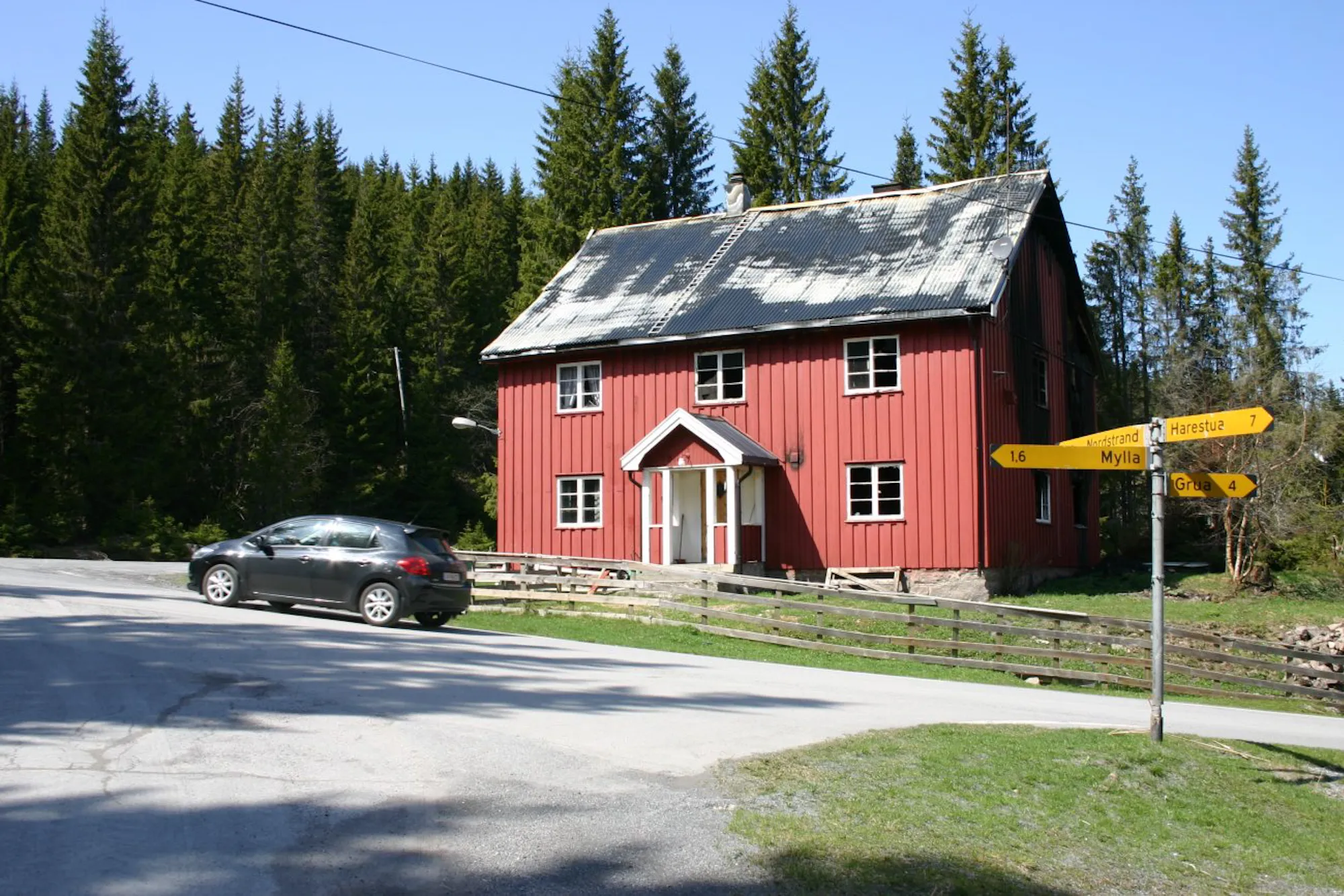 FLYFOTO: Det lille bildet er et utsnitt i full bredde av et større bilde av området øst for Mylla. Bildet er et flyfoto tatt av Widerøe Flyveselskap, angivelig i 1969, men med spørsmålstegn bak årstallet. Det er fritt tilgjengelig i Oslo Byarkiv i denne grove oppløsningen. Bildet viser østenden av Mylla, Myllsfløyta og muligens to bygninger øst på Sliperiet. Det store bildet kommer fra Lunner Historielag, og kan vise en av fabrikkbygningene ved Sliperiet. I bakgrunnen skimtes muligens også en bit av rørledningen til turbinen. Bygningen ser meget luftig ut, men har likevel to skorsteiner. Muligens en lagerbygning? Den har ikke grunnmur, men står på pillarer. Dett kan forklare mangelen på ruiner i området. Bildet kan ha vært håndkolorert. Dette, og lavspent trefase kraftledning kan tyde på at det kan være tatt i tiden rundt første verdenskrig.