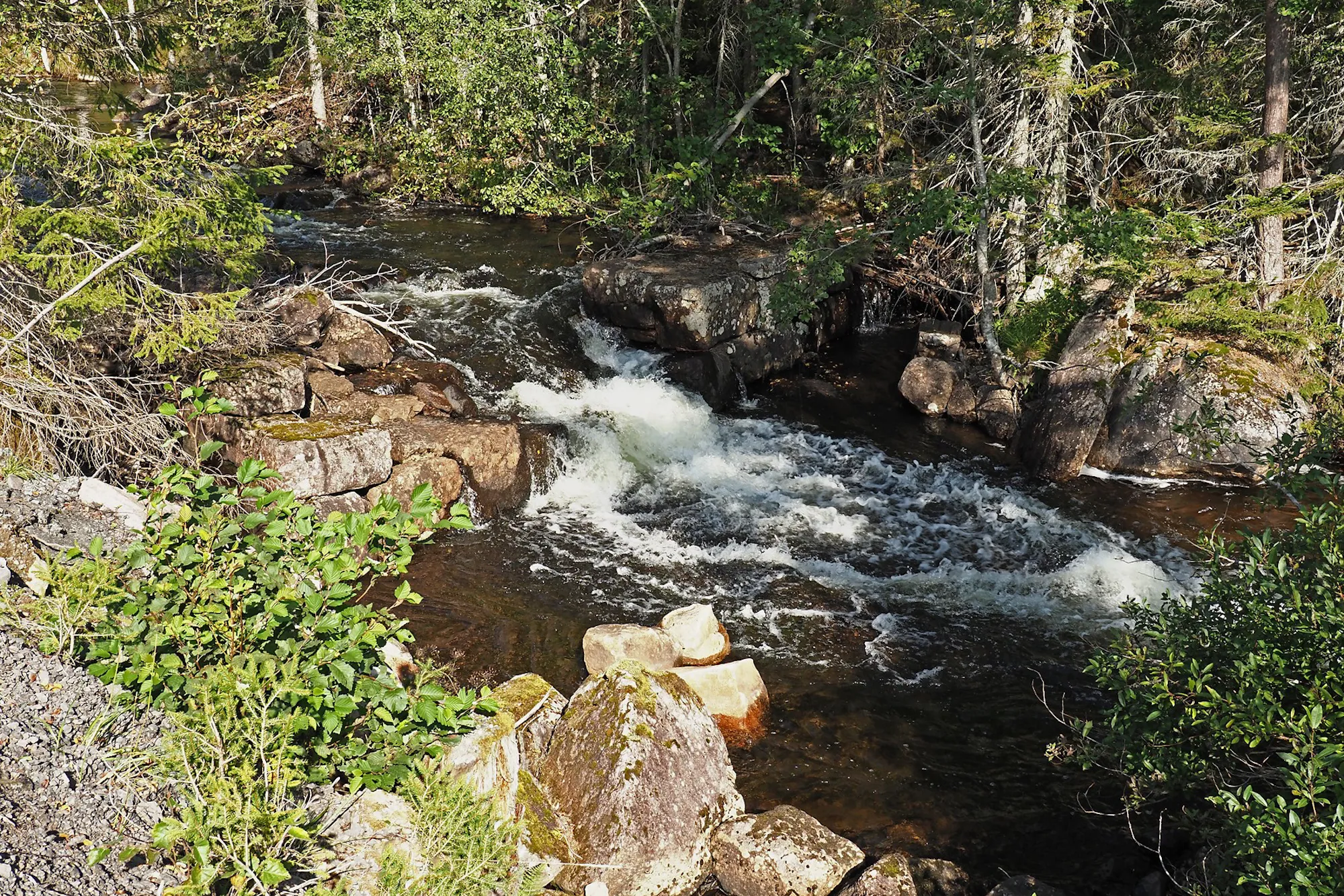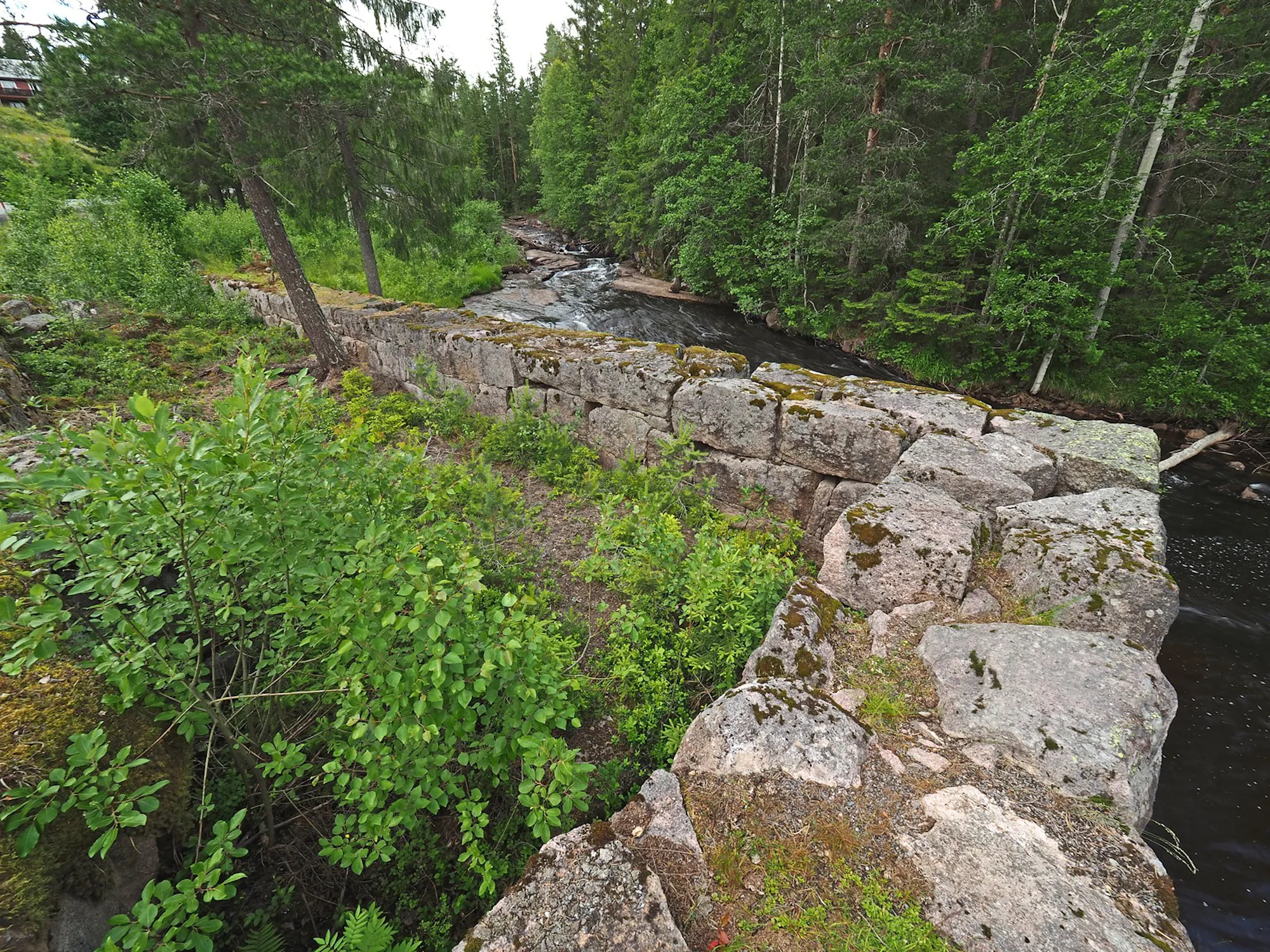 FANGDEMNING: Rett nedenfor Bolchen Træsliberi står disse restene av en demning. Det må ha vært en fangdemning til en eller annen installasjon lenger ned i elva, for det er ikke plass til noe reservoar på oversiden, kanskje til Blyverket. Demningen holdes på plass med jenbolter i hull som er boret ned i svaberget som elva renner over.