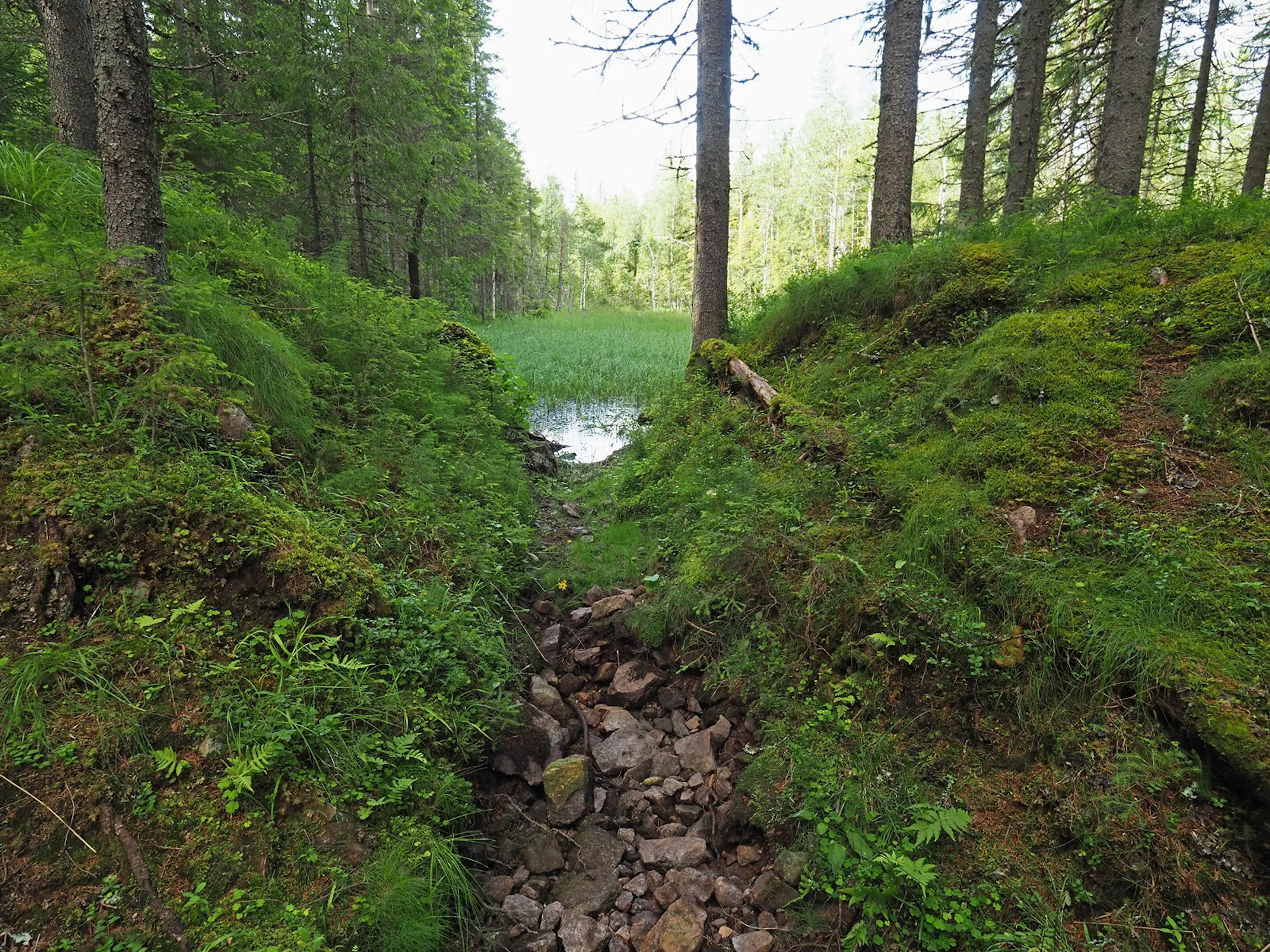 ATTHALDSDEMNING: Kubbdammen var det siste vannmagasinet før Bolchen Træsliberi. Det var en naturlig fordypning i terrenget med største lengde ca. 170 meter og største bredde ca. 125 meter. I syd ble det bygget en atthaldsdemning i jord blandet med stein. Som bildet viser, er den nå ødelagt av erosjon ved flom etter at tresliperiet ble lagt ned. Selve Kubbdammen er nå en nokså bløt og tettvokst myr med et grunt og sivbevokst vann i sydenden.