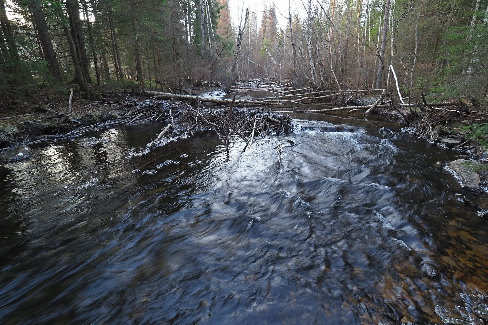 MYR OG BEVERFELTE TRÆR: Terrenget ovenfor Noackdemningen er ganske flatt, og elva deler seg i flere løp der. En blanding av myr/sump og beverfelte trær gjorde det svært tregt å ta seg frem langs det nordligste løpet. Bare trær som var gnagd for en god stund siden, ingen beverhytte eller demning. Men beveren hadde hatt større ambisjoner enn et sideløp: Rett etter at alle tre løpene hadde gått sammen igjen, hadde den demt opp hele Myllselva. Aktiviteten i et stort, litt eldre hogstfelt rett ved hadde antageligvis fordrevet beveren, og så hadde en flom tatt nesten halve demningen.