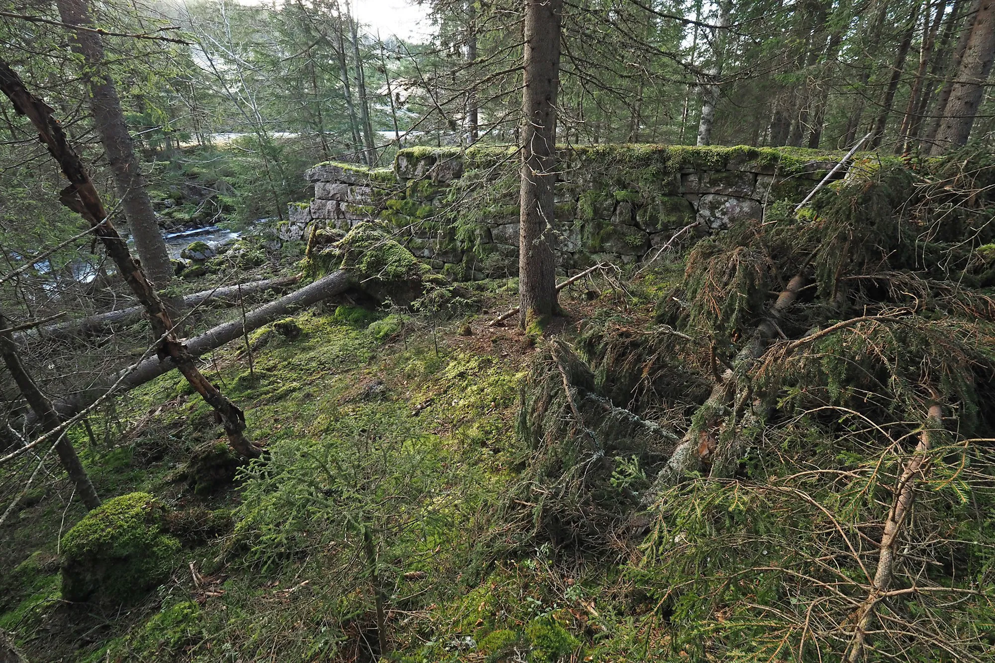 MINDRE FORSEGGJORT: Dette bildet viser luftsiden til demningen til Mylla Sag. Det viser klart at demningen er mye høyere enn bildet av vannsiden indikerer. I forhold til de andre demningene er muringen mindre forseggjort, med mange flere mindre steiner for å fylle ut rommene mellom de store byggesteinene. Demningen har to tappeluker og et overløp, og antageligvis en bunnluke hvor rørledningen til sagas turbin startet. I alle fall er det i det området vannet kommer ut nå. I vestenden av demningen har forfallet tatt til, og den er ikke sikkert tilgjengelig derfra.