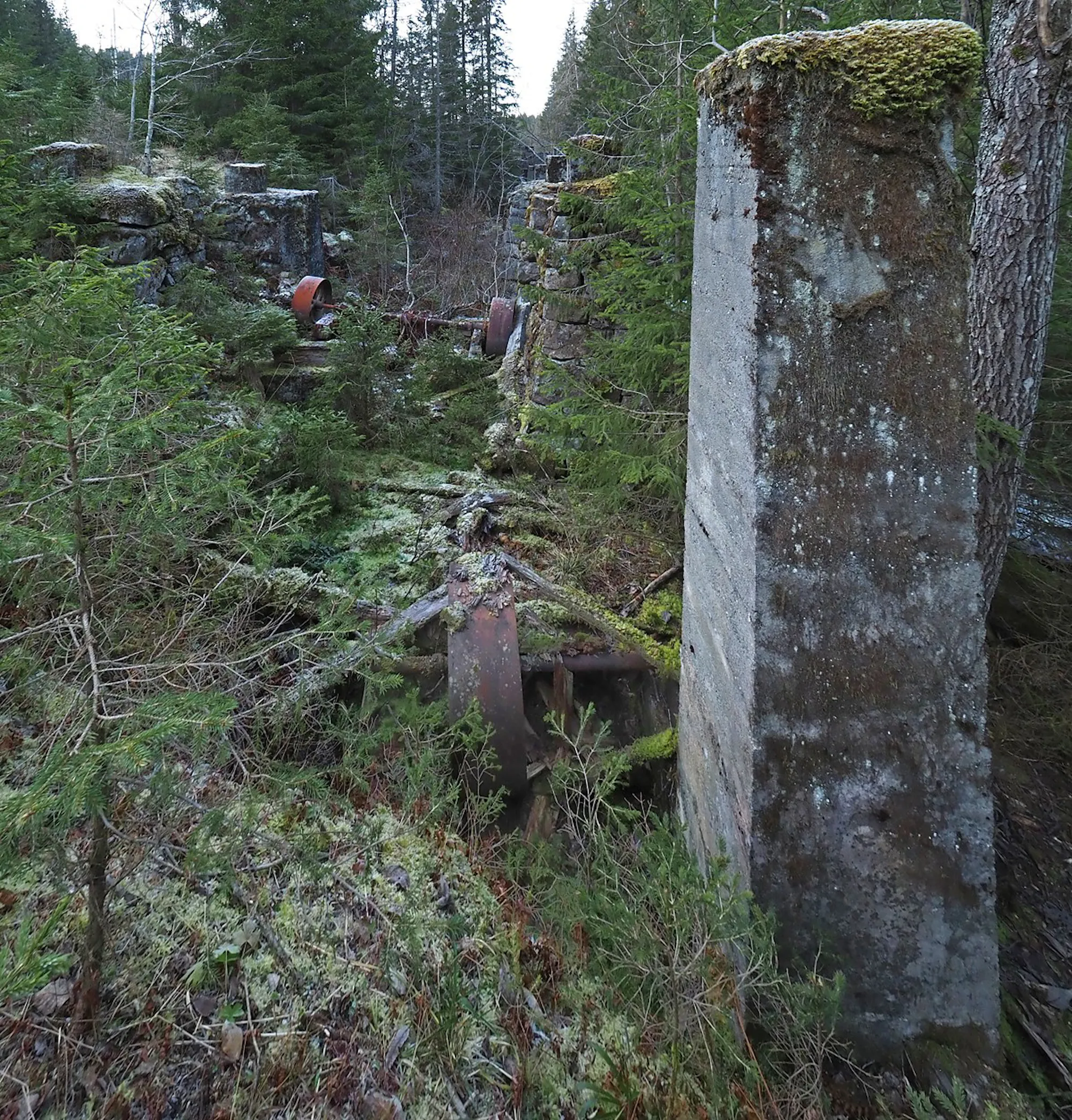 MONUMENTALT: I tiden da Mylselven Træsliberi var i drift, var det store dimensjoner på tømmeret. Med gode priser på skurlast var det mer lønnsomt å bruke de grove stokkene til materialer og bare lage tremasse av mindre dimensjoner og avkapp. Eieren av Mylselven Træsliberi bygget da en turbindrevet sag rett nedenfor sliperiet. Turbindriften gjorde det mulig å utnytte vannet fra sliperiet en gang til. Bildet viser søylene som sagbygget sto på, og en drivaksel med to remhjul. Sagdriften opphørte i 1949.