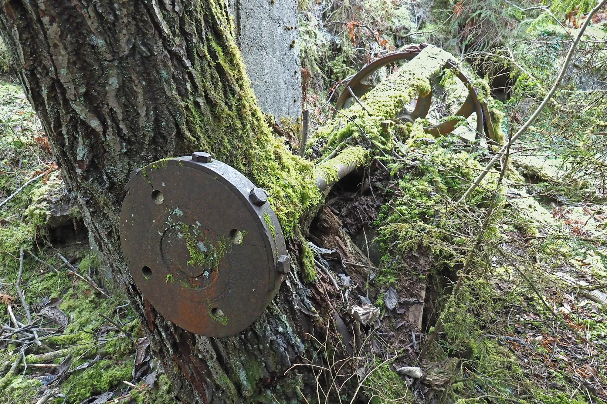 FRACISTURBIN: I elvekanten rett nedenfor den nærmeste akselen står det rester etter turbinfundamentet til saga. Fundamentet er noe ødelagt, men noen av festeboltene til turbinen sitter fortsatt på plass. Med den fallhøyden som var her, var det sannsynligvis en Fracisturbin, som hadde utløp i hullet der fundamentet er knekt. Men avløpshullet i toppen av fundamentet er ikke synlig. Det kan være dekket av topplata som har forskjøvet seg.