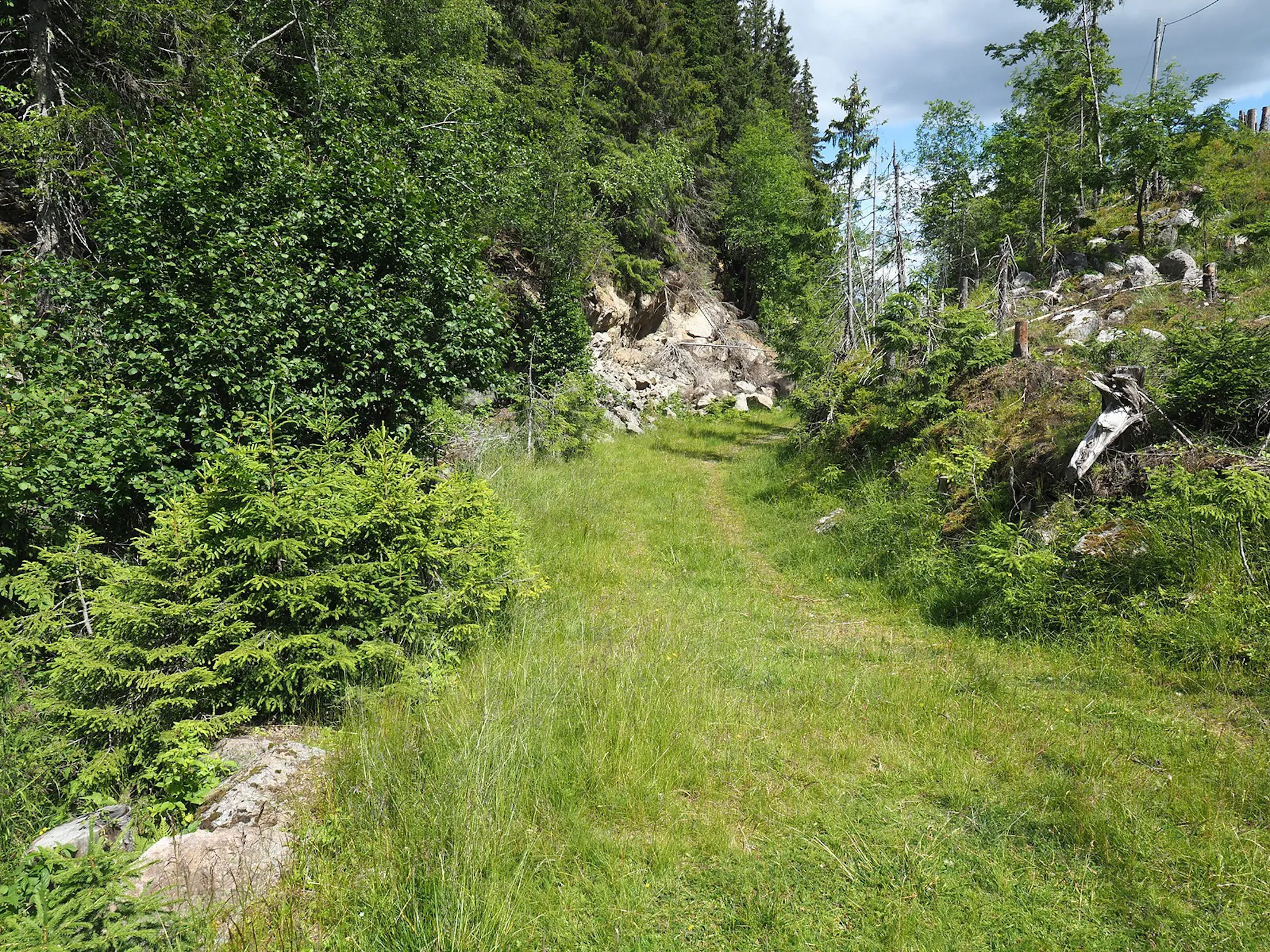 VANNKANAL: Det ser ut som en driftsvei, og vinterstid er det også skiløypa mot Svea. Men her var det opprinnelig gravd en kanal som ledet vannet vekk fra selve Myllselva og til reservoaret som demningen laget. Kanalen ble ødelagt av Myllsveien da den ble oppgradert, men er synlig ved utgangen av skjæringen mot nord.