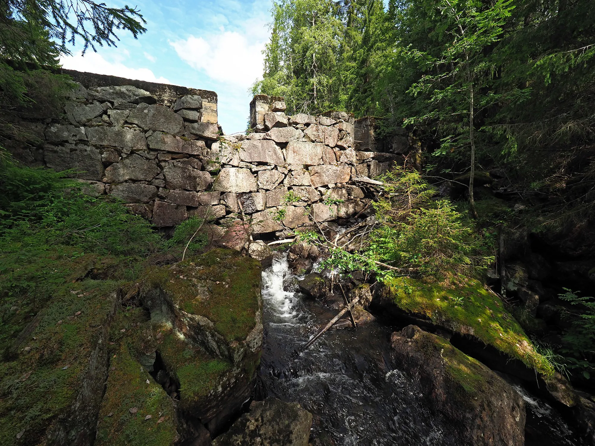 TØRRMURT GRÅSTEINDEMNING: Fra bilveien ser det ut som ei bru, men det er en demning med bunnluke, tappeluke eller muligens fløtningsløp, og overfall på to nivåer. Dette er en tørrmurt gråsteindemning, antageligvis bygget etter storflommen i 1908, og senere tettet med støp på vannsiden. Flytetorver demmer nå opp vannet før demningen.