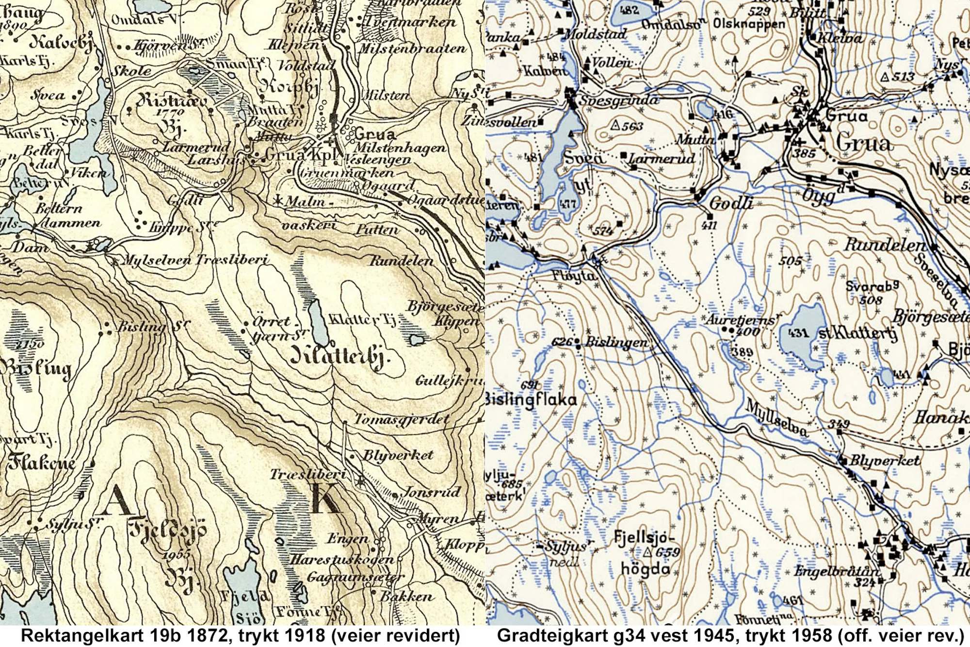 MYLLSELVA MED INDUSTRI PÅ KART FRA 1918 OG 1945: I løpet av over 100 år forandrer både bebyggelse og veinett seg, så derfor er også gamle kart sjekket opp for å se utviklingen av industrianleggene. På rektangelkartet fra ca. 1918 viser symboler beliggenheten av både Sliperiet (fabrikk) og Mylla sag (sagbruk), og Bolchen Træsliberi (fabrikk). Navnet Mylselven Træsliberi er feilaktig plassert ved symbolet for sag. Demningene ved Mylla og ved Myllsløken er vist, men ingen flere. Det er ikke vei mellom Sliperiet og Bolchen Træsliberi. Det er et lite vann, Knippahøla, øst for Sliperiet. Rimeligvis var ingen av industrianleggene vist på førsteutgaven av kartet fra 1872. Gradteigskartet fra 1945 viser bare Mylla sag. Nå er det vei mellom Sliperiet og Bolchen Træsliberi, Vestbygdveien. Det er fortsatt ikke vei mellom Sliperiet og Svesgrinda. Det lille vannet øst for Sliperiet har blitt til ei myr. Terrenget har også forandret seg ifølge kartene, men rektangelkartet er laget på grunnlag av en eldre og mer primitiv oppmåling.