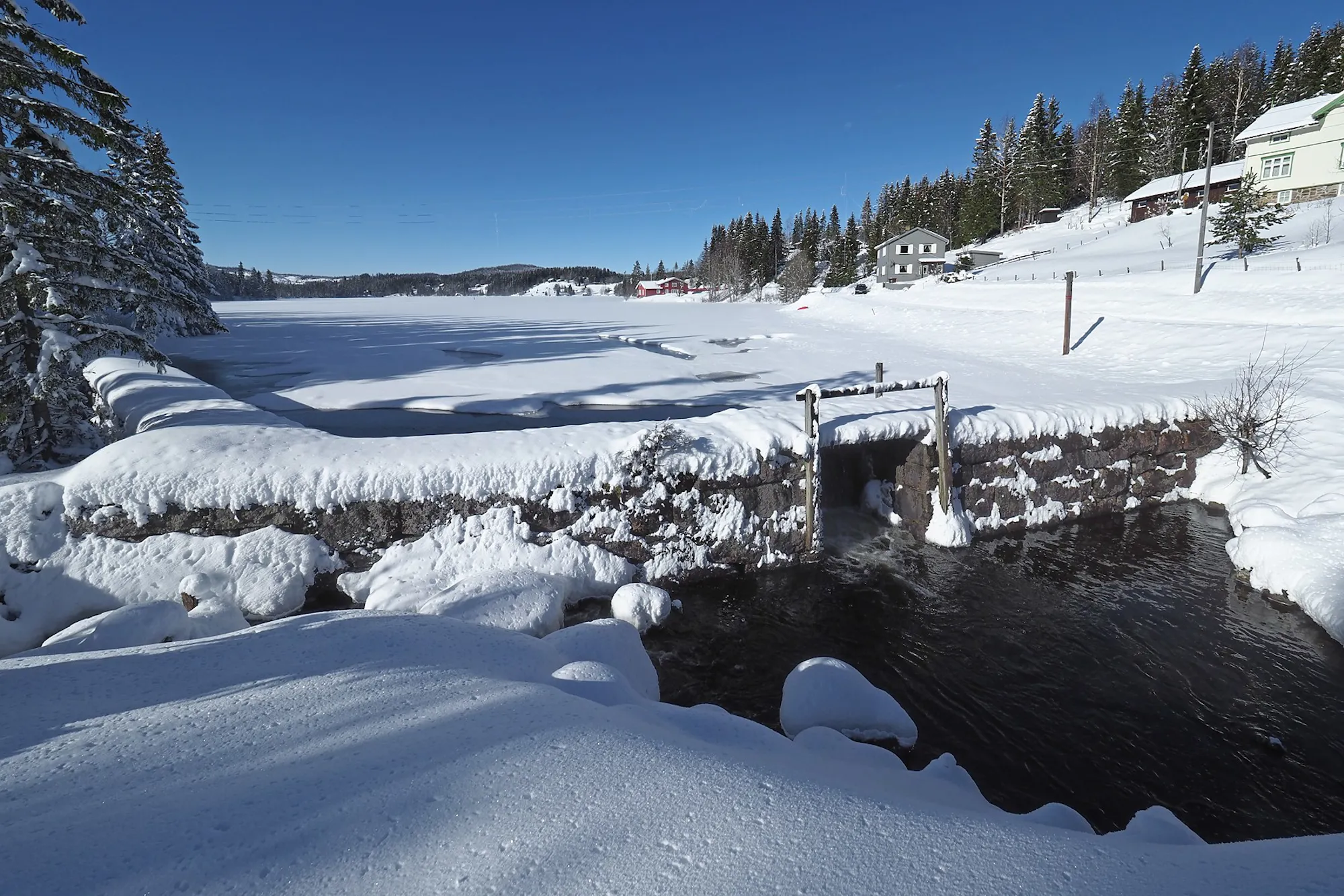 USIKKER IS: Vinterstid kan demningen ha et kledelig dekke av snø, men isen foran utløpet er ofte usikker og har råker.