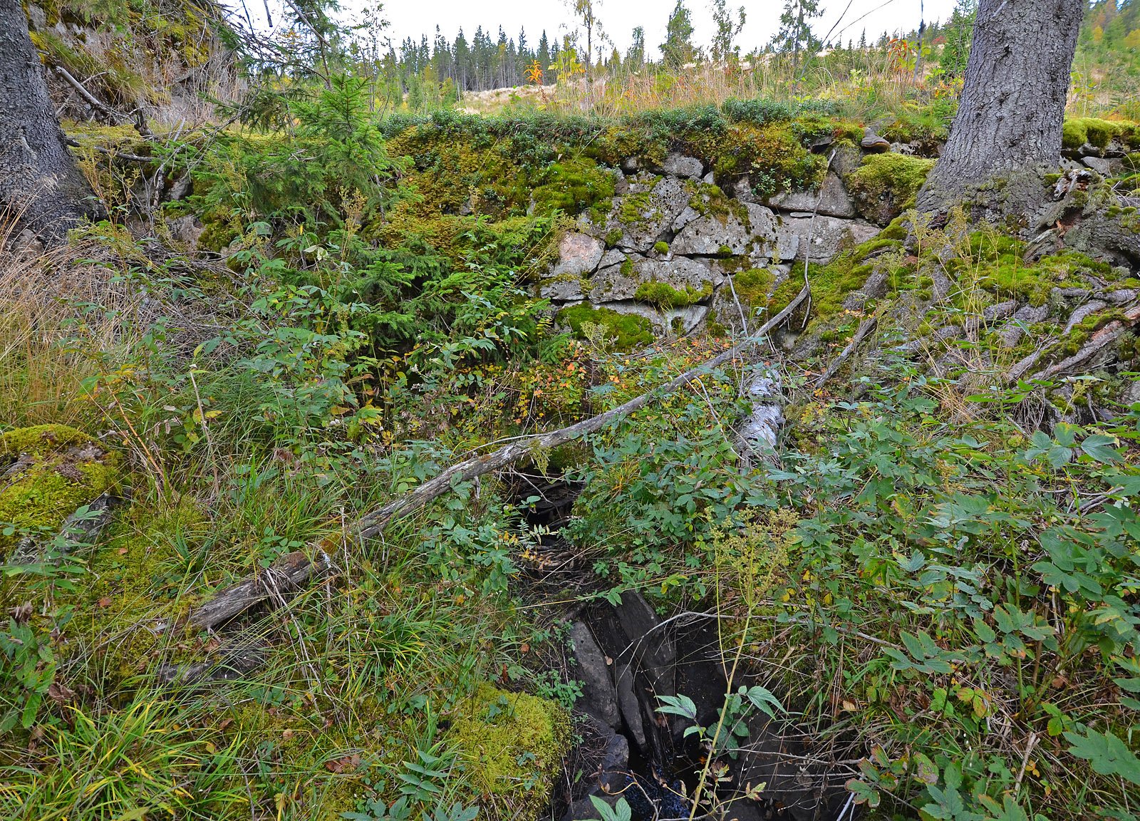 PETTER GRANTOPP: Demningen ved Åbortjern ligger om lag 40 meter fra nordenden av tjernet i et nytt hogstfelt. Et fint sted å sitte i ettermiddagssola og meditere over hvordan Petter Grantopp som guttunge kunne rekke over alle de fire demningene og sleppe dem i løpet av en time. Men den gangen var det ikke vanlig at barn hadde klokke. Dette er den loddrette luftsiden av demningen. Bekken fra Åbortjern kommer sammen med bekken fra Nordsetertjern ved Kleivstua og renner ned i Krokkleiva.