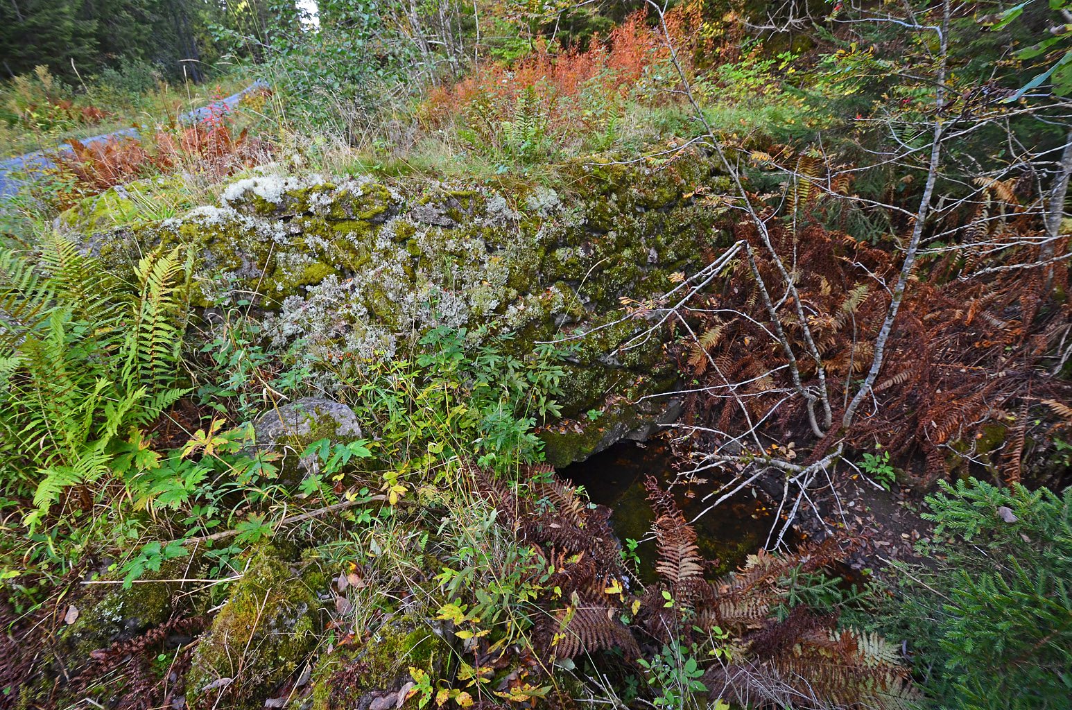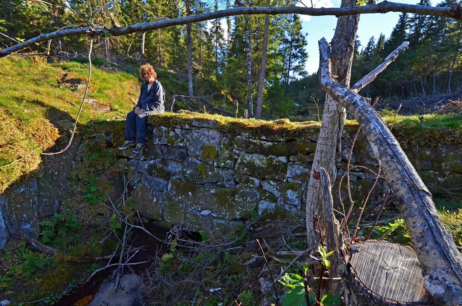 MOSEGRODDE RESTER: Dronningveien 7 ble bygget der Sundvoll-mølla sto. Eldre kjentfolk som vi senere traff ved Kongens utsikt, husket steinene i fundamentet, og at disse ble brukt som underlag for huset. Nå er bare de mosegrodde betongveggene i avløpet tilbake.
