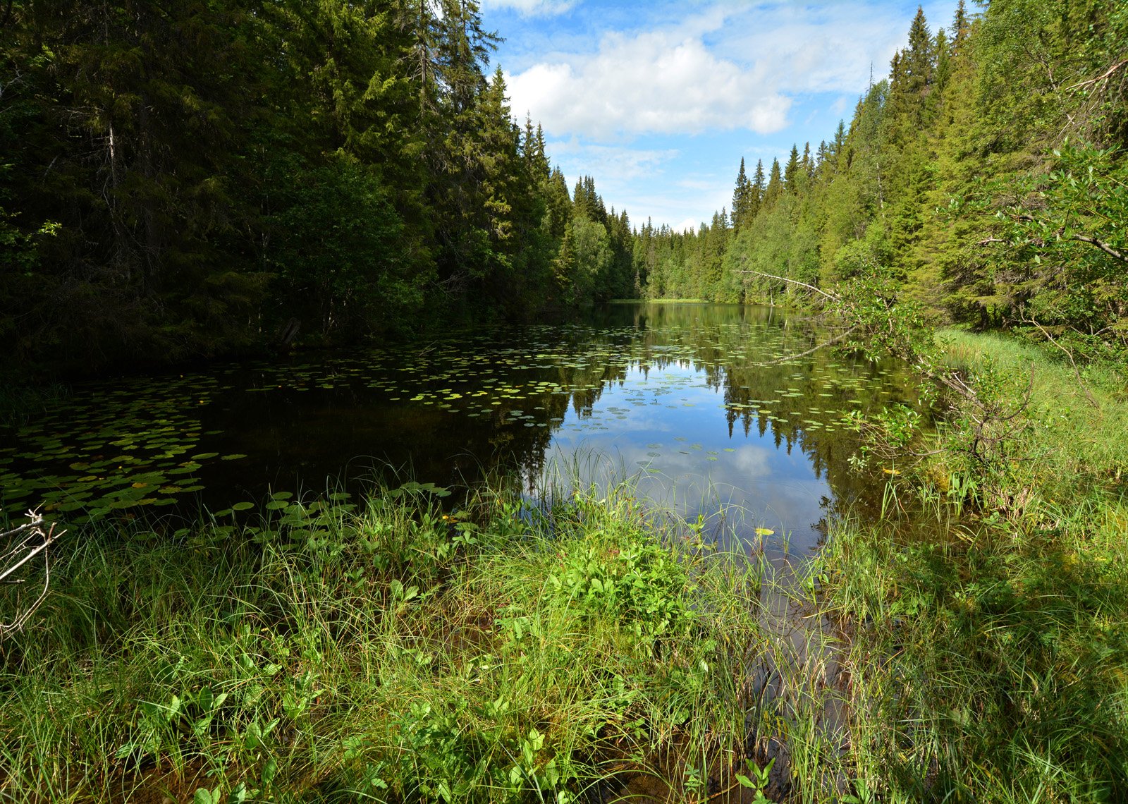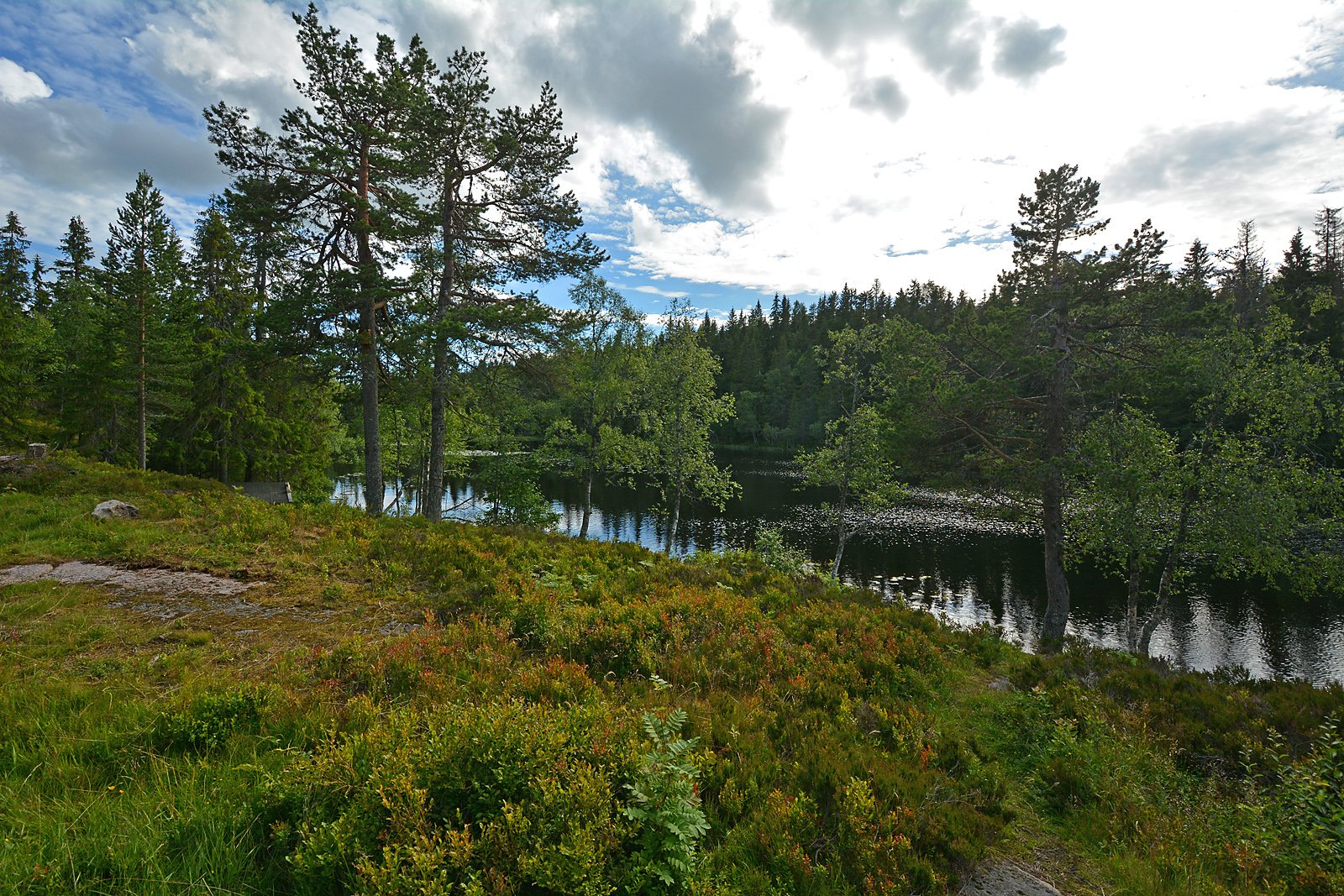 GEITRAMS OG VANNLILJER: Lysløypa fra Bergenske Kongevei går over et stort hogstfelt til sydenden av Nordsetertjern. Over et lite stup er det bra utsikt mot sydenden av vannet. Myra syd for vannet var fuktig, men greit passérbar også denne våte sommeren. Sørsetraveien er synlig gjennom løvverket på motsatt side av vannet.