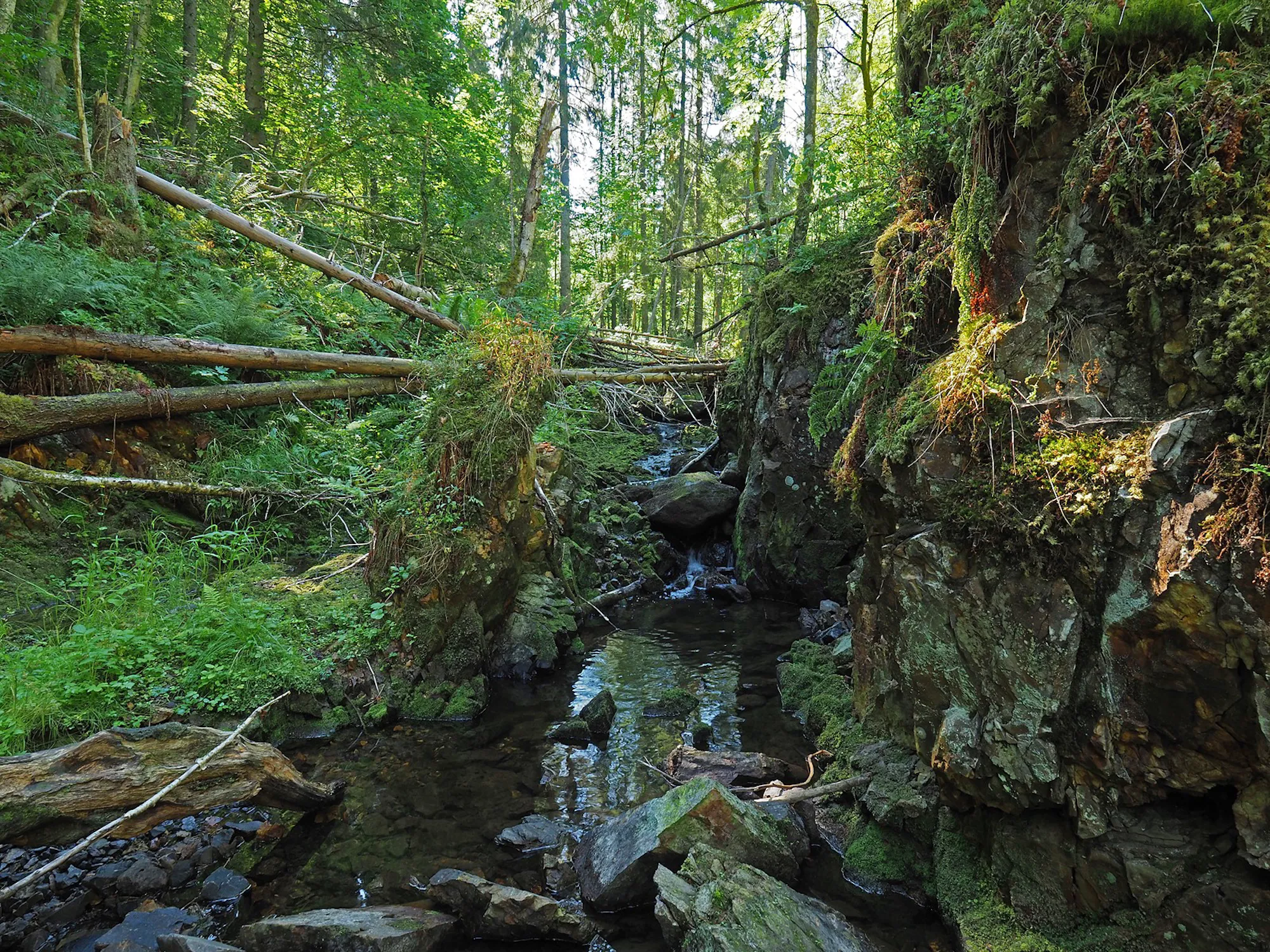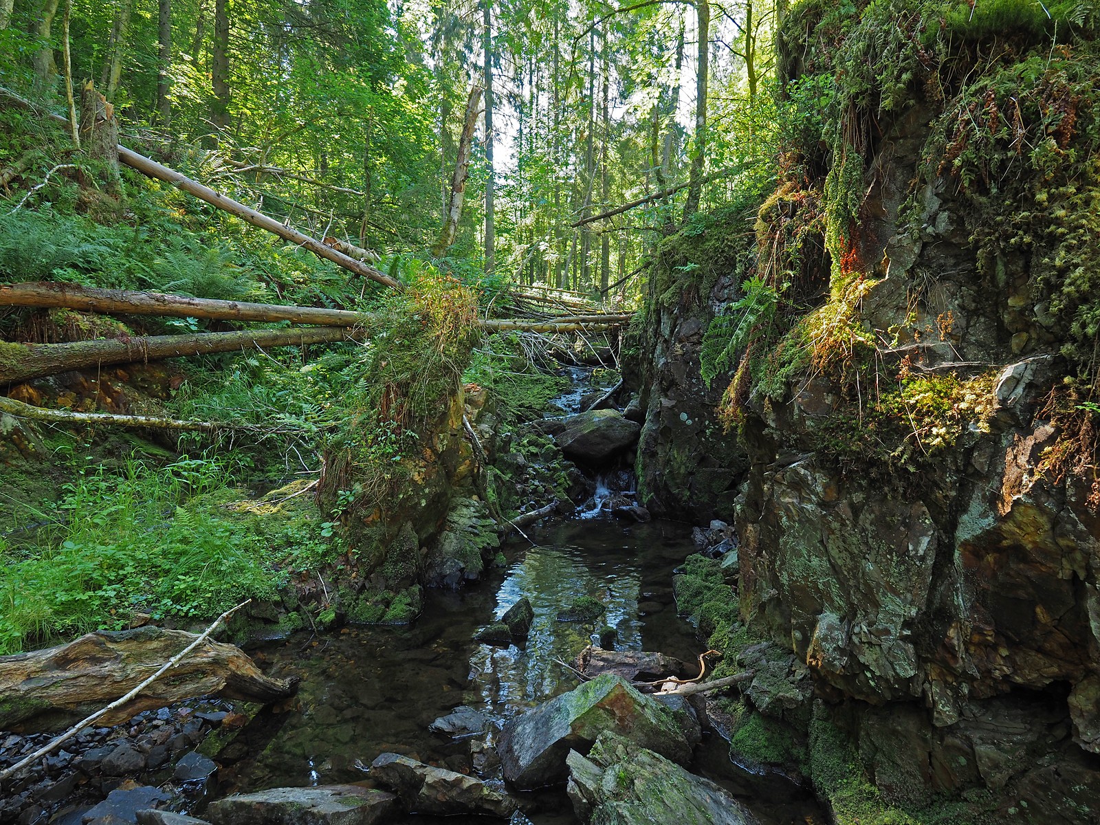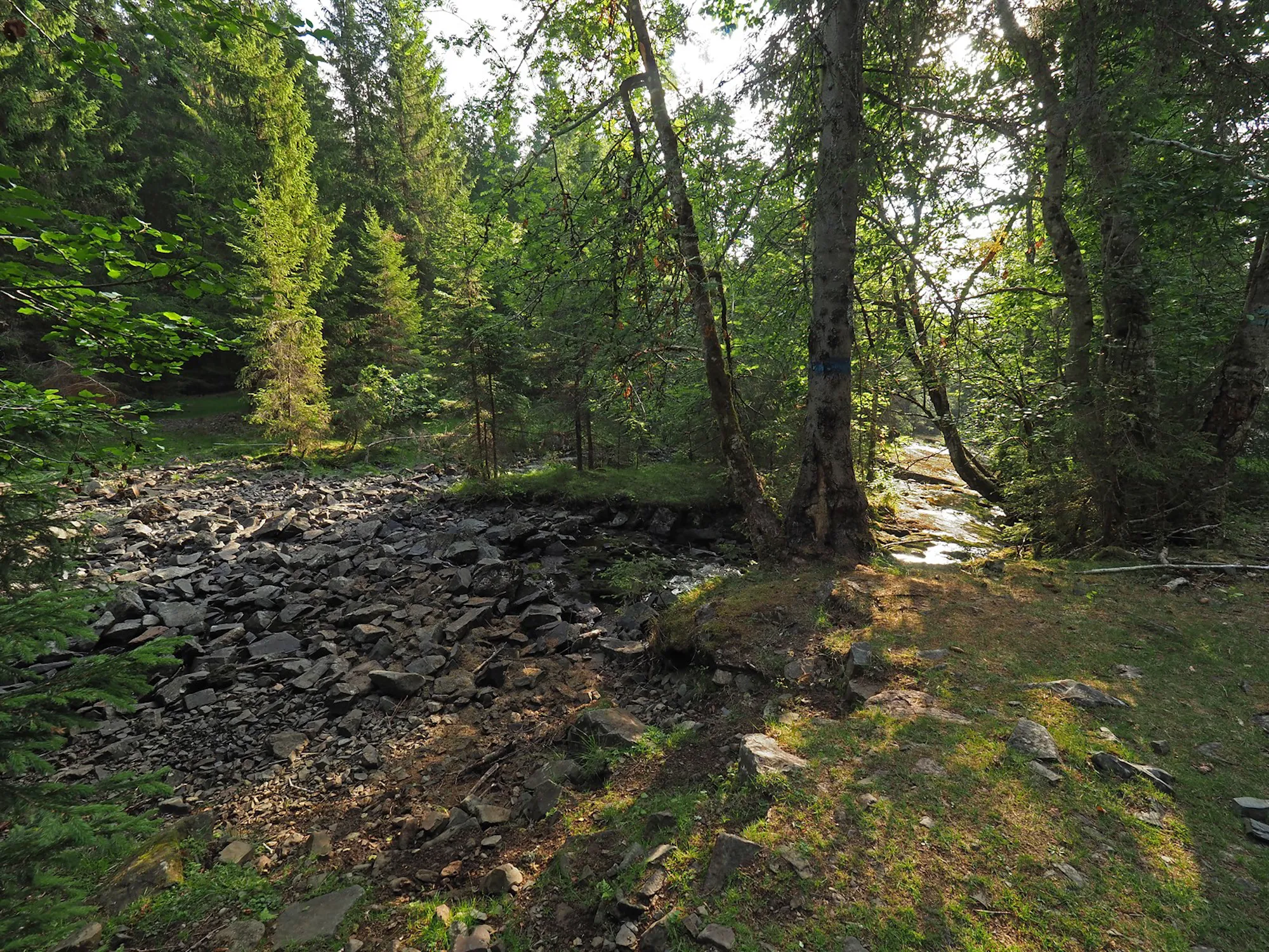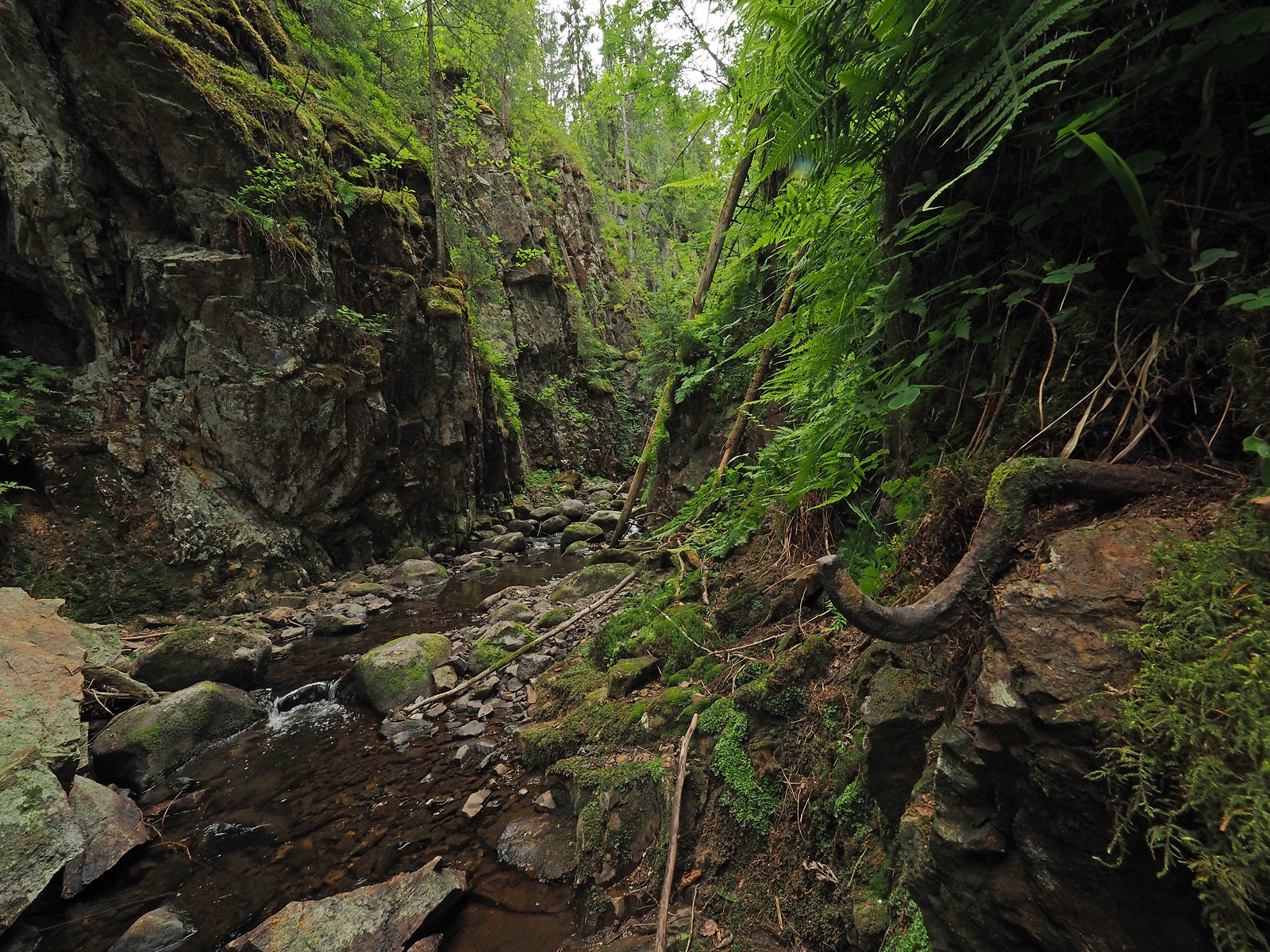 URSDALEN ELVECANYON: Bunnen i denne kløfta er steinet og glatt, og ganske uryddig med vindfall. Stedvis er det vanndammer som dekker hele bunnen, og gjør det vanskelig å passere tørrskodd selv ved så liten vannføring som nå etter tørken. Selv ved normal sommervannføring vil det være krevende å ta seg frem her, og i flom vil elva hele veien dekke hele bunnen og gå opp på sidene.