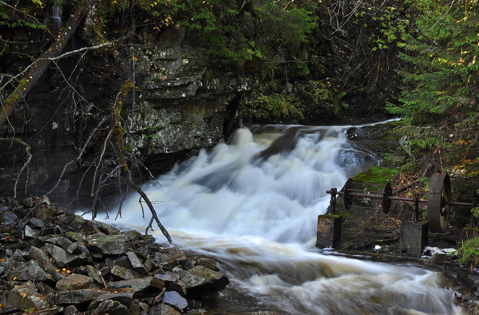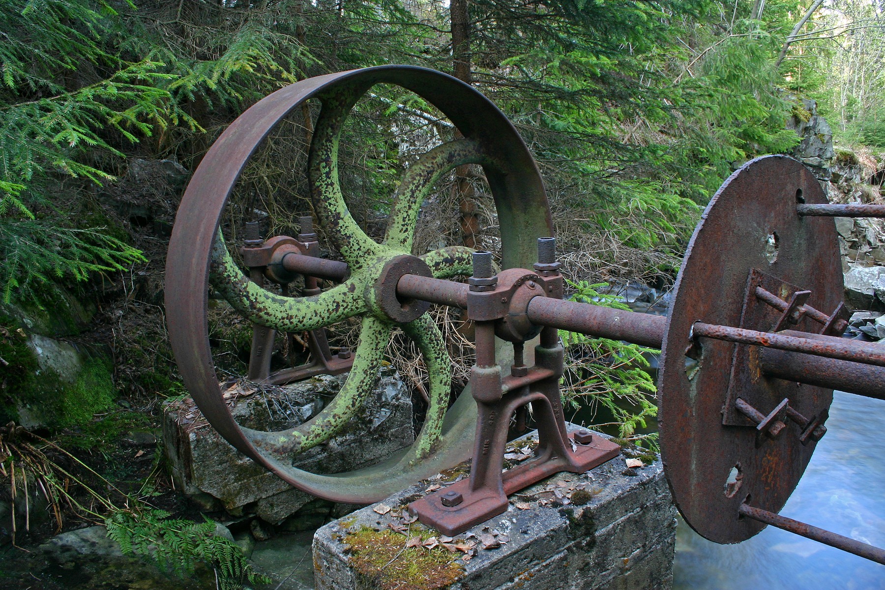 FLOMSAG: Omtrent 250 meter ovenfor Persbråtan står denne mekaniske innretningen i kanten av elveløpet. Det ser ikke ut til at delene egentlig passer sammen, og gamle er de også. Men i 1943 var disse delene tilpasset hverandre med kløkt og trekiler, slik at det var et fungerende drivverk til ei sirkelsag som sto litt høyere oppe langs veien. Nå er treverket råtnet vekk, og jernplatene som skovlene var festet til rustet bort og herpet, men bare ti år tidligere var det fortsatt rester etter disse.