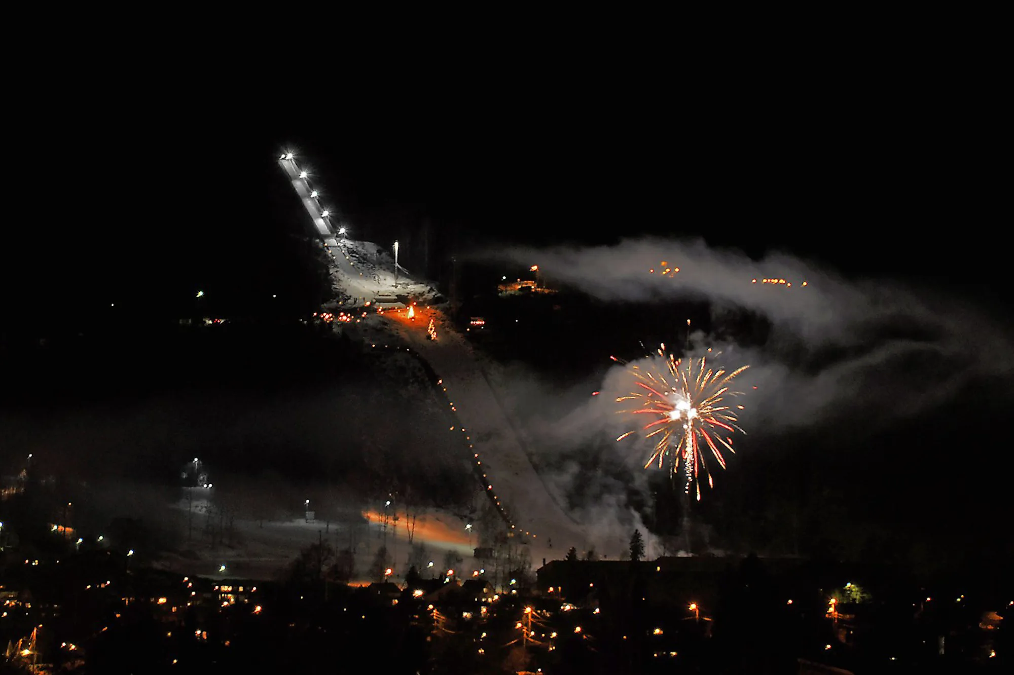 NYTTÅRSFEIRING: På Skui er det etter at Skuibakken ble utvalgt til kulturminne tradisjon å feire nyttår med bål og raketter fra unnarennet. Slik tok det seg ut fra vår veranda 3 km lenger mot øst.