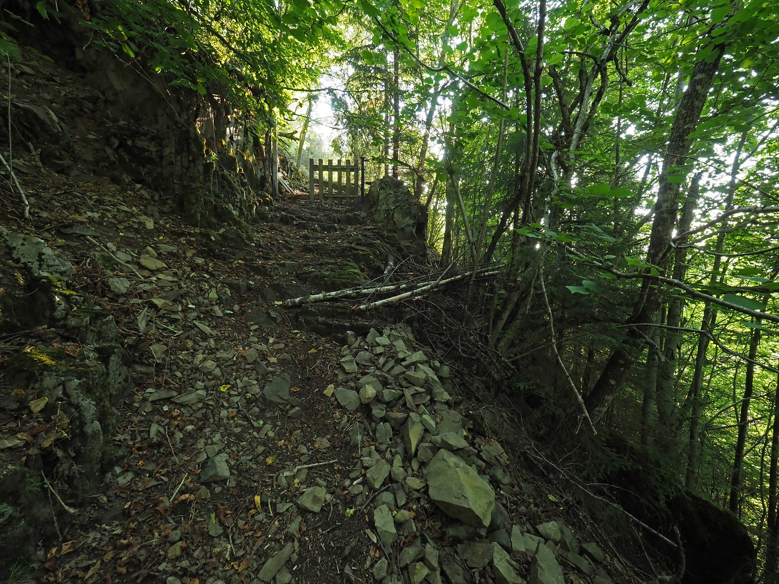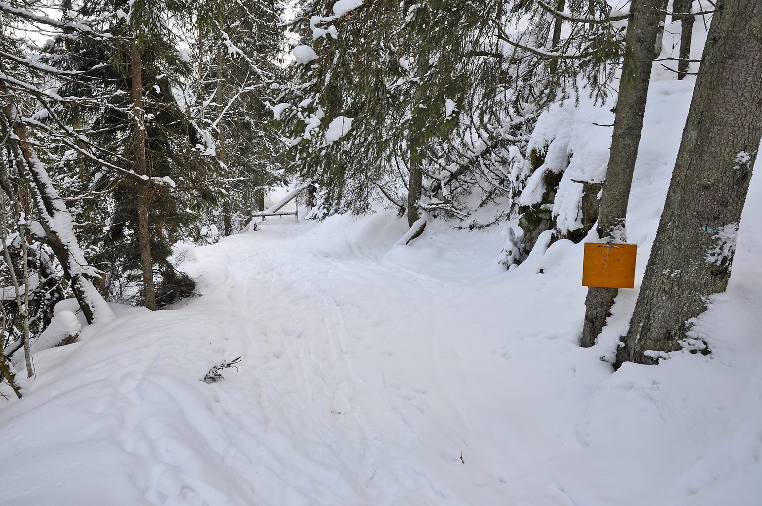 Blåstien videre ned dalen forbi Kastefossen er en bratt tømmervei som ble bygget i tiden rett før år 1900. Opprinnelig ble den kalt Nykastet, men etter hvert fikk den økenavnet Skosliter'n. Som bildet viser, har navnet sin berettigelse: Her gikk det hardt ut over skoningene til både to- og firbente når dette stykket skulle forseres. Om vinteren var dette også skiløype, og en skikkelig utfordring nedover, særlig med skare som ikke bar. Det ga ikke mersmak.