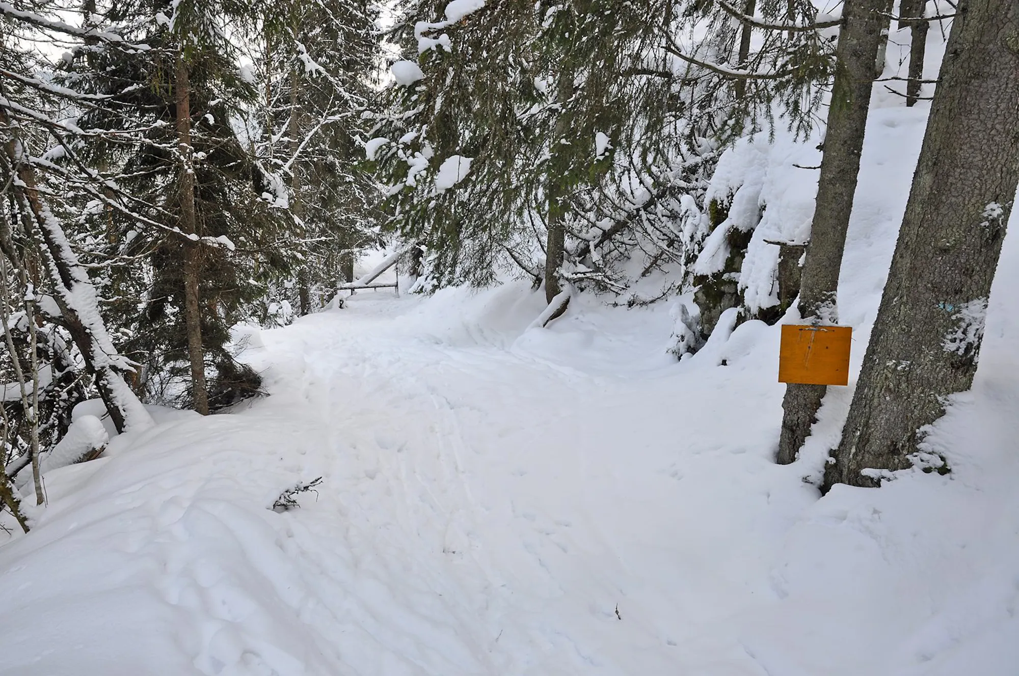 KREVENDE LØYPE: Tidligere var Skosliteren en viktig løype inn i Vestmarka fra Kirkerud og Tanumplatået. To gule fareskilt har overlevd, men teksten er vekk. På bildet er årsaken til skiltet tydelig: Trang port og grind tvers over løypa. Etter en femmils tur på Krokskogen midt på 70-tallet avsluttet vi med å kjøre ned Skosliteren på skare som bare delvis bar. Det ga ikke mersmak.