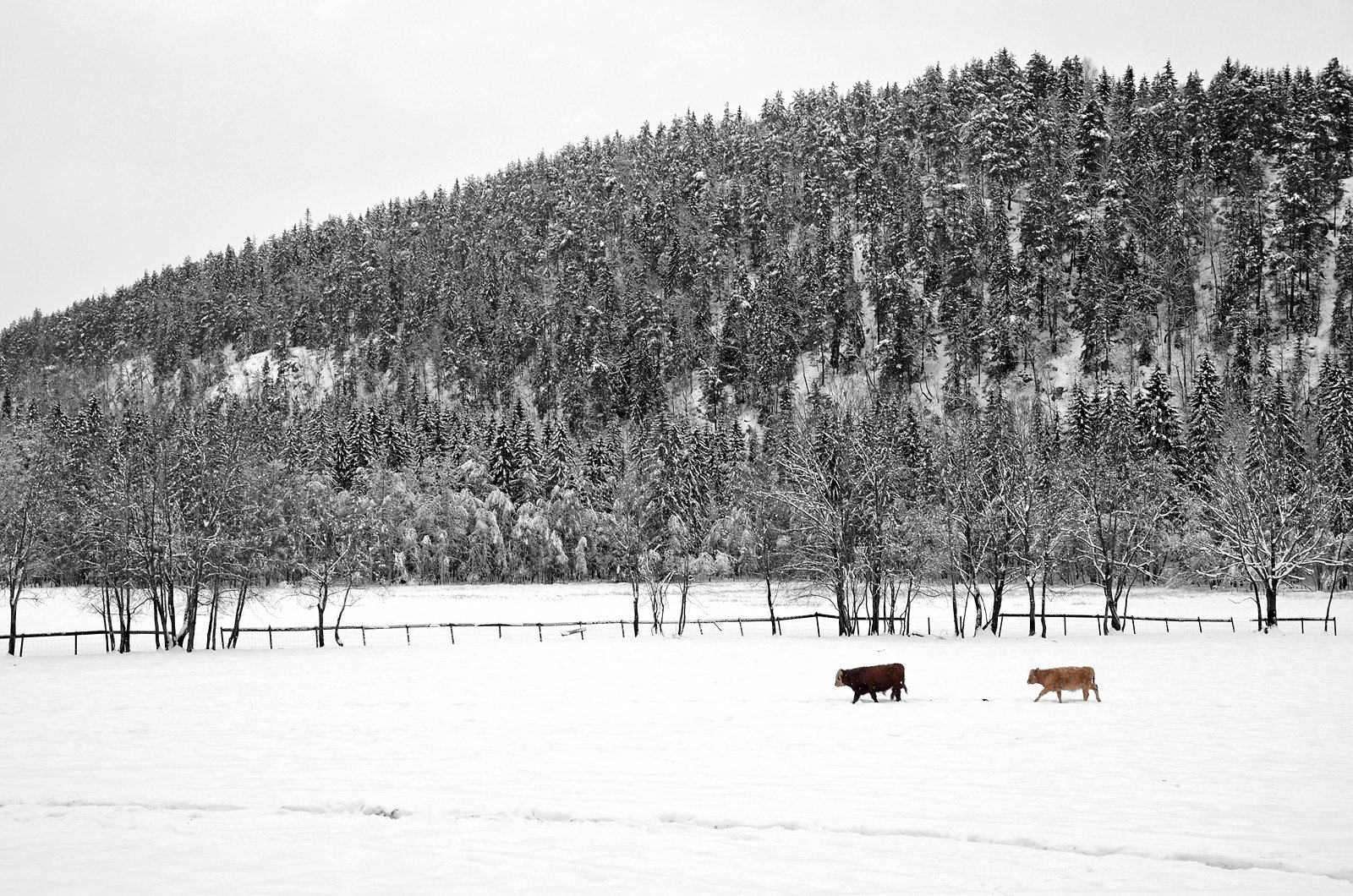 ROBUSTE DYR: Ursdalen er ikke bare bratte bakker og stein. I dalbunnen er det også gårder, som drives på en litt spesiell måte. Kveg og sauer her er av spesielt robuste raser, som går ute om vinteren og overnatter i meget luftige fjøs.