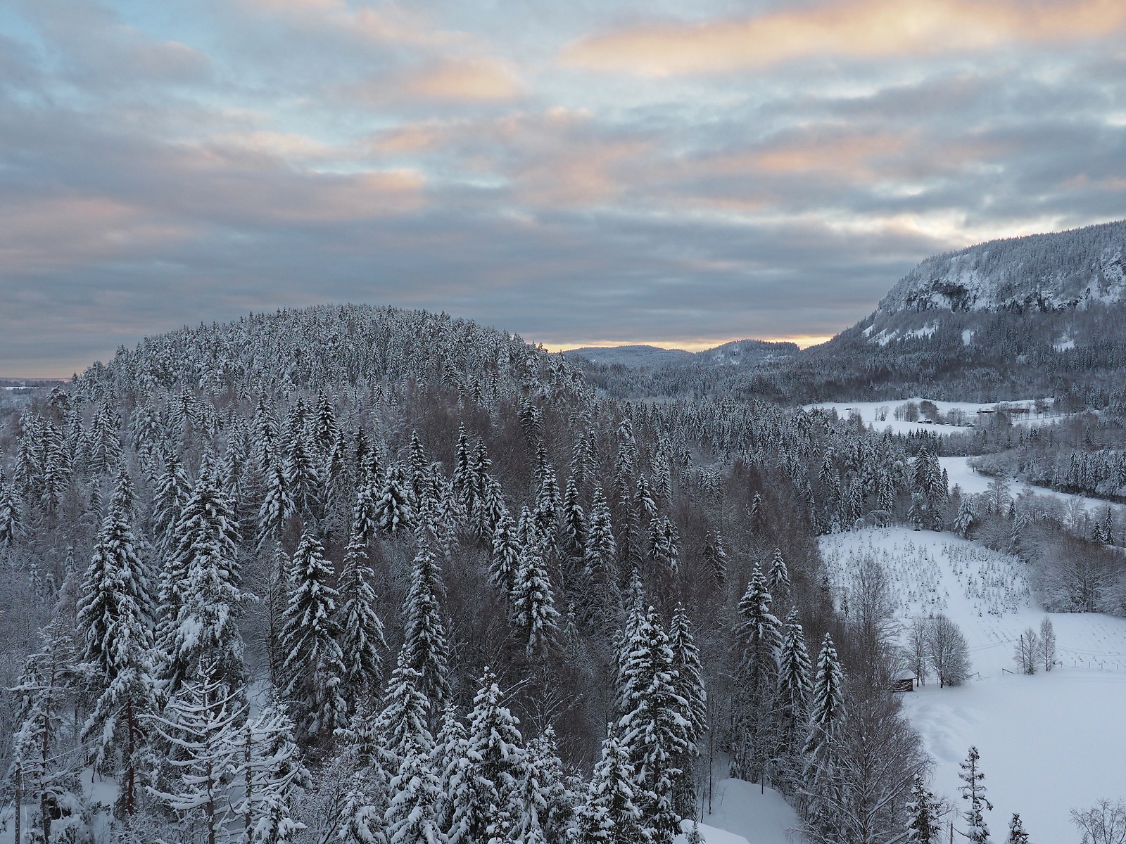 UTSIKT MOT SYD: Dette er utsikten mot syd over Ursdalen med jorder, gårder og juletreplantasjer. Åsene i venstre del av bildet er Svartoråsen som går over i Ringiåsen. Til høyre i bildet reiser Ramsåsen seg med stup og urer, og i bakgrunnen ligger Kattås nærmest og Skaugumsåsen bak denne.