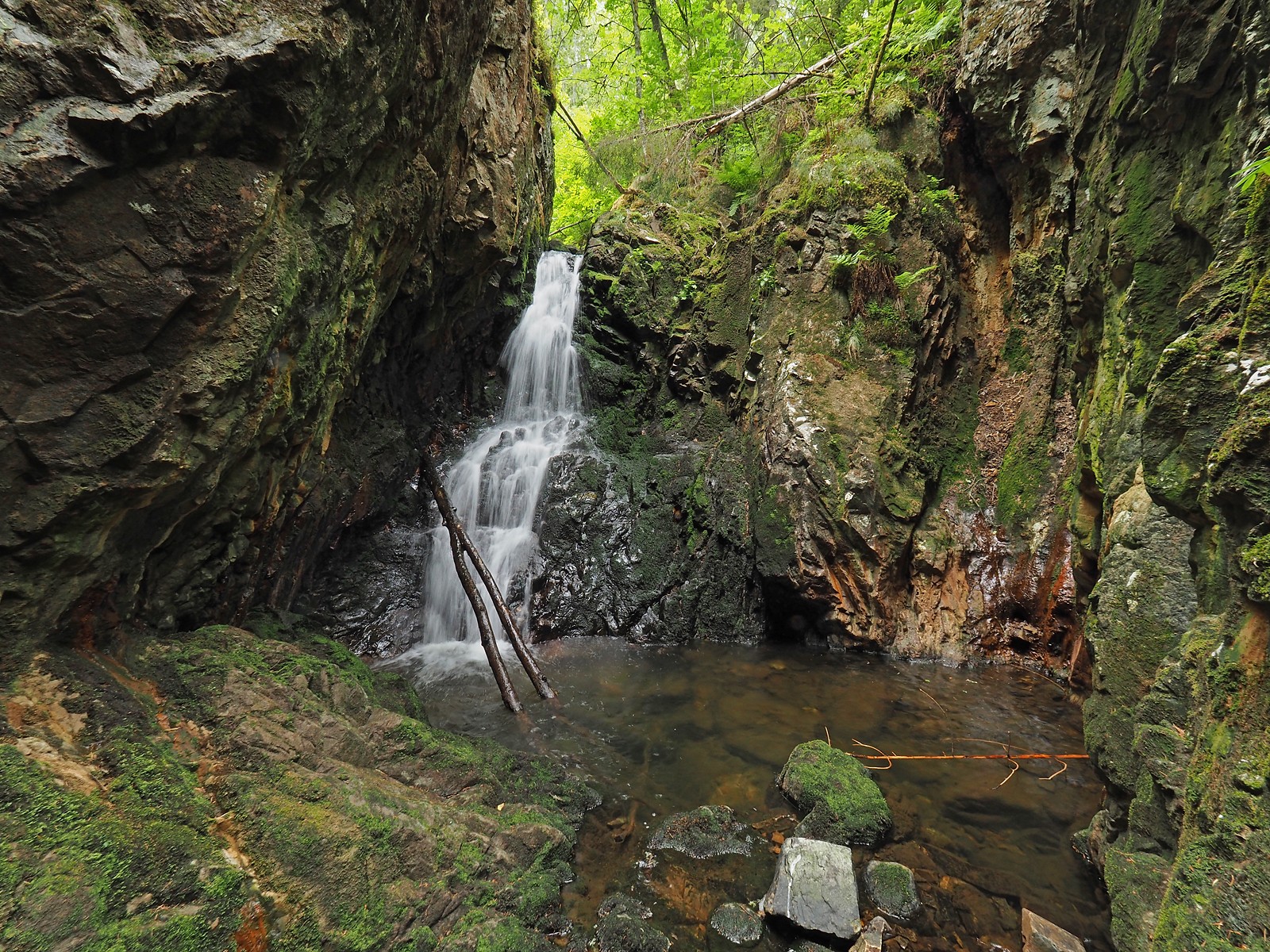HER MÅ DU SNU: Ved Sølvhølen gjør kløfta en skarp Z-knekk, og der finnes denne kanskje seks meter høye fossen. Dekorativ å se på, men umulig å forsere uten først å bli våt og deretter ta en stor risiko ved å klatre opp det svært sleipe elveløpet. Så her må man snu, eller krabbe opp på høyre side av skjerpet etter først å ha krysset elva.