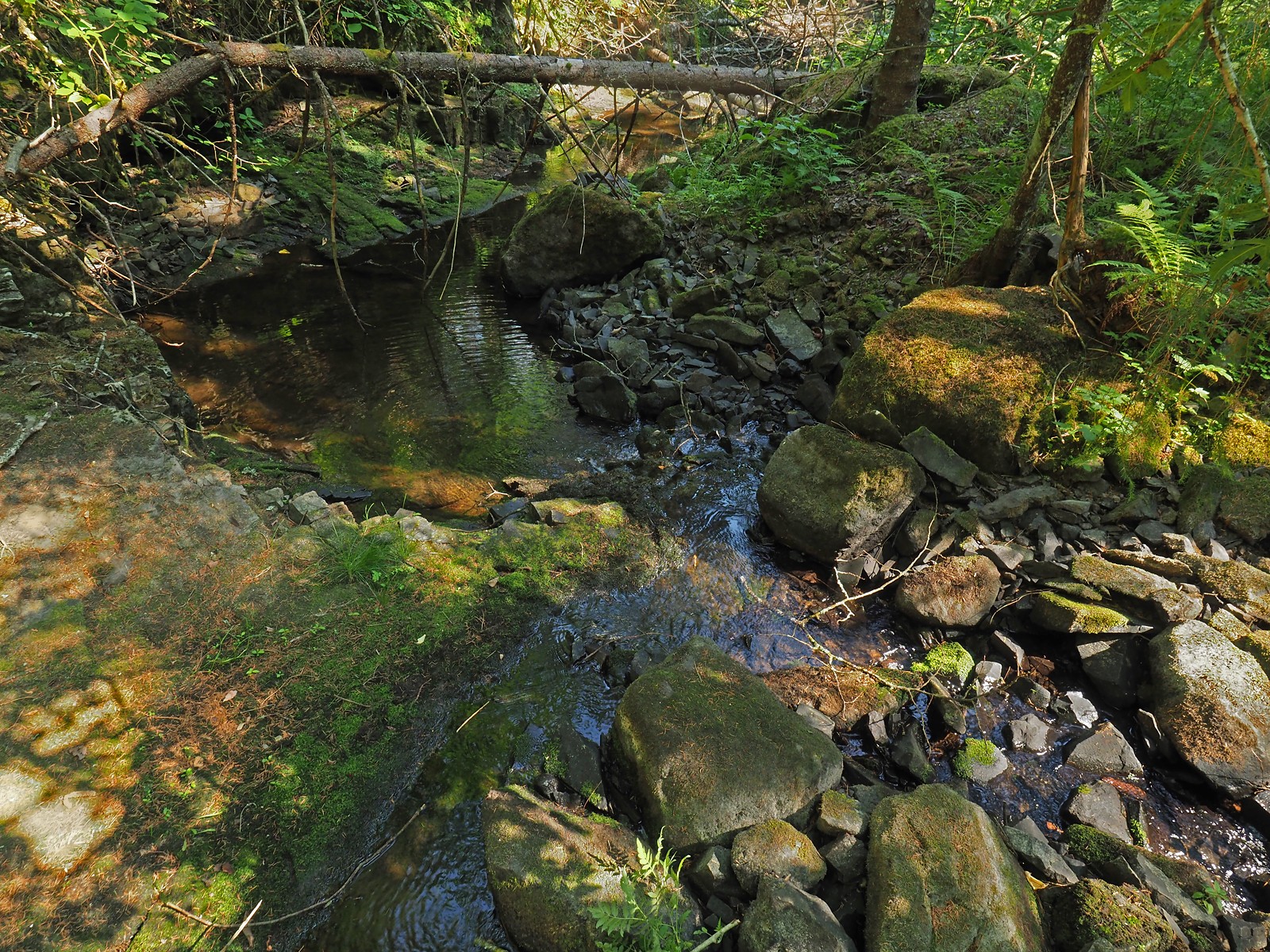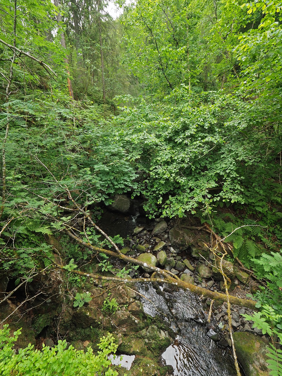 Nå fortsetter blåstien på nordsiden av elva, av og til nesten inntil den, av og til lenger vekk. Om man i stedet for å gå blåstien vil følge elva hele veien, blir turen lett til en liten dagstur gjennom kratt og opp og ned skrenter. Men turen langs og i elva gjemmer små idyller som denne, som gir belønning for strevet. Langs blåstien er det i juni/juli store arealer med ramsløk, en plante som kan luktes lenge før den kan sees.
