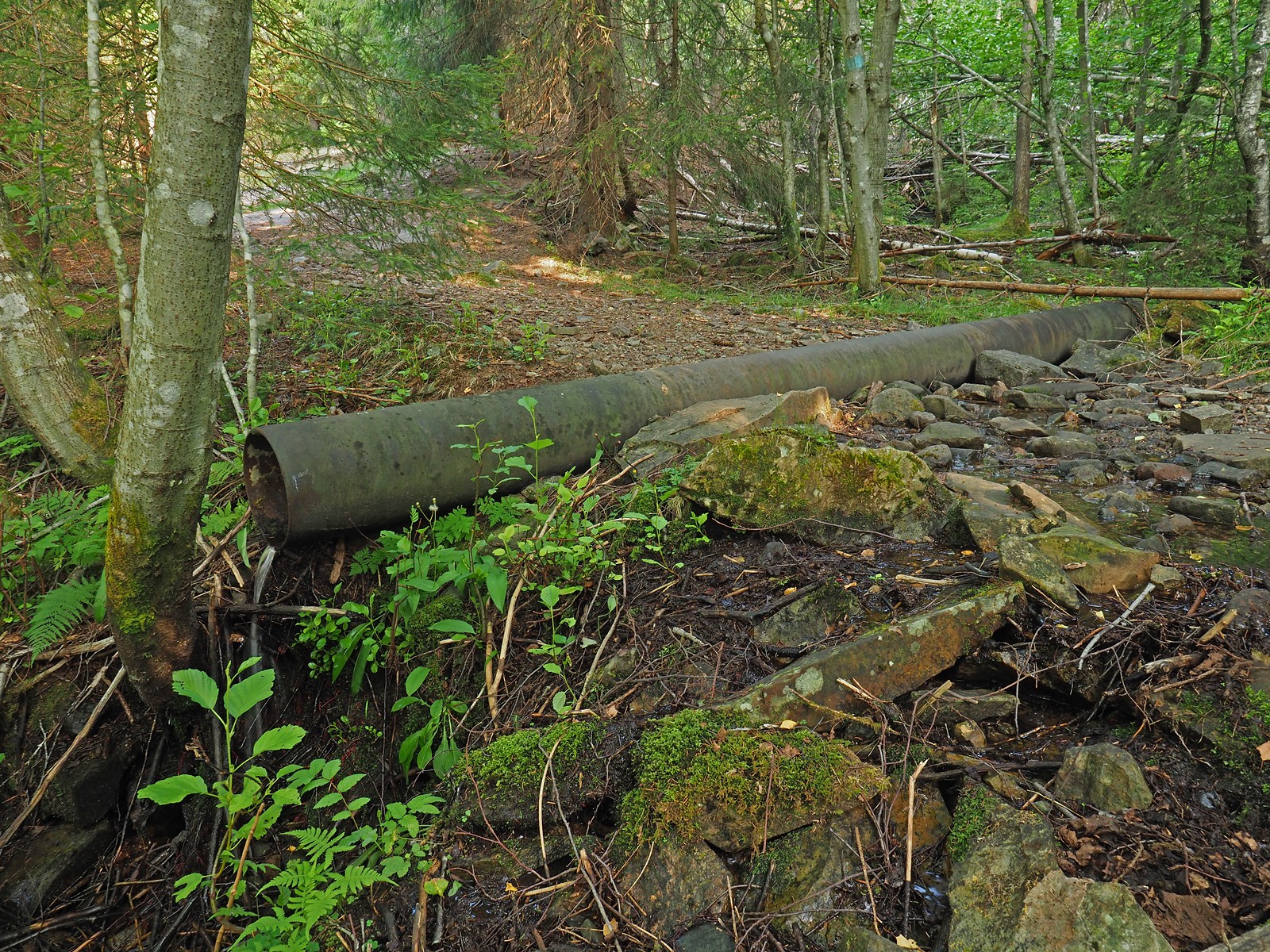 VANNLEDNING SOM STIKKRENNE: Det er spor etter vannverket i elva og på blåstien/driftsveien på nordsiden av elva. Dette er en rørseksjon som ligger om lag 120 meter nedenfor Nedre Vad. 150 meter nedenfor denne ligger en annen seksjon, men den har en heller symbolsk funksjon, siden innløpet er høyere enn bekken der, og bekken renner videre i stien.
