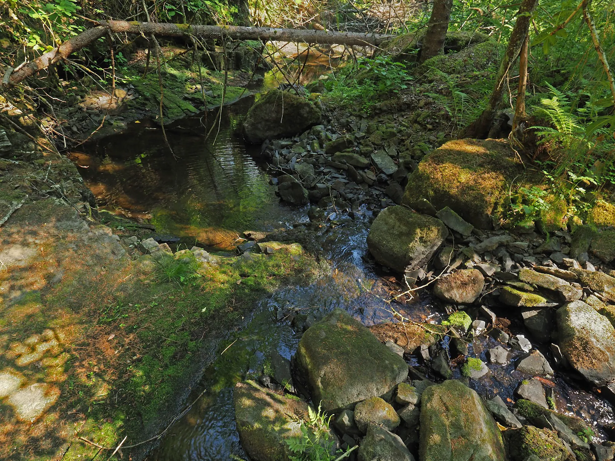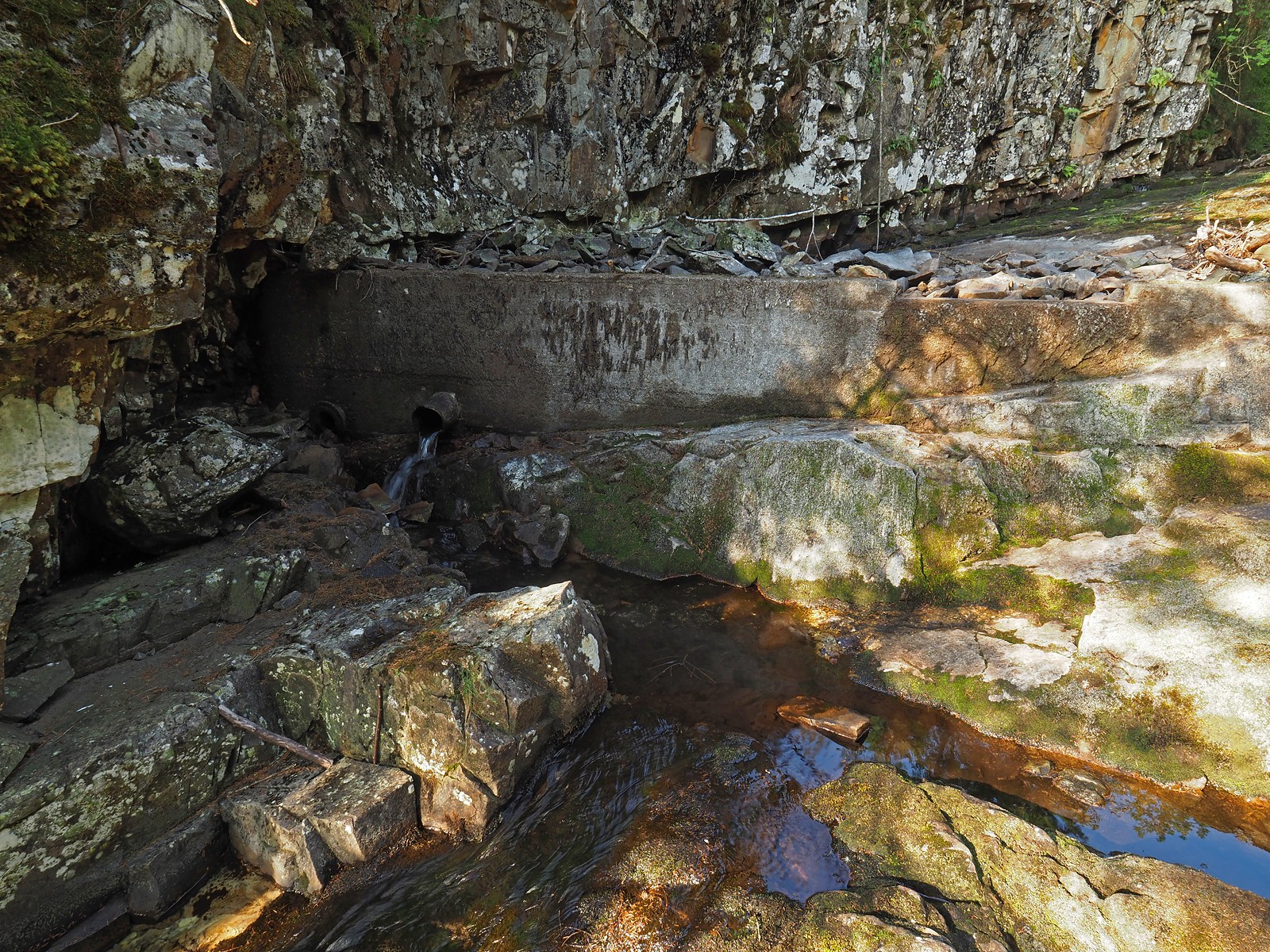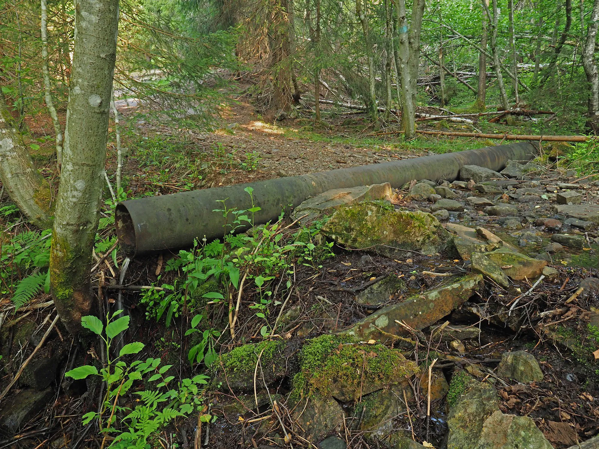 Der blåstien krysser en liten bekk omtrent 130 meter nedenfor Nedre Vad, ligger det en stikkrenne av støpt jernrør. I elva omtrent 60 meter ovenfor denne er det i et bratt parti med svaberg en foss som ser mistenkelig regelmessig ut. Ved lavere vannføring viser det seg at dette er en oppmurt demning, hvor det stikker to rørstusser ut. I elva nedenfor ligger det flere bruddstykker av støpte jernrør, og det er enda en stikkrenne over blåstien omtrent 250 meter lenger nede.
