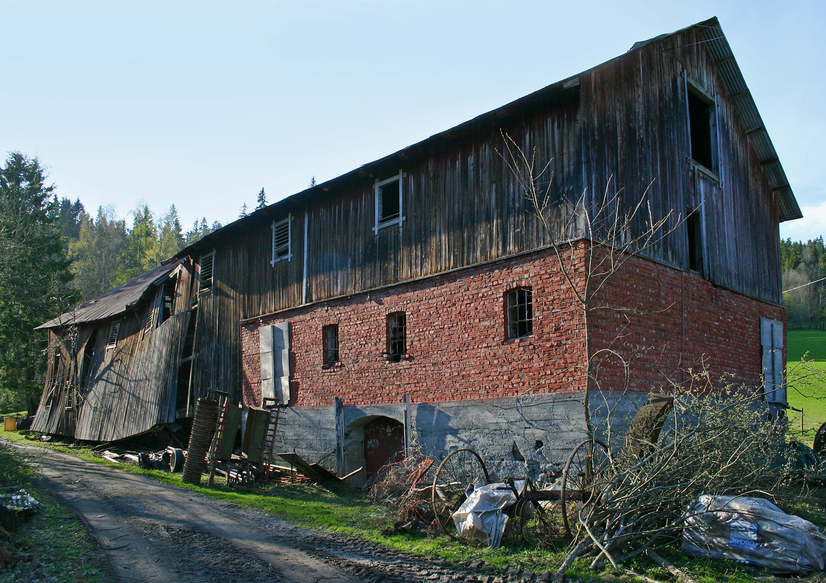 LÅVEN PÅ PERSBRÅTAN I 2004: Låven på Persbråtan var lenge monumentalbygget i Ursdalen, det største og godt synlig når man kom litt inn i dalen. Dette er mitt eldste digitale bilde fra 2004. Da var treverket i heller dårlig forfatning, mens mursteinsdelen sto forholdsvis støtt. Omgivelsene var preget av at redskap som ikke virket eller ikke var i bruk lenger ble hensatt der de var ute av veien, men ikke ute av syne.