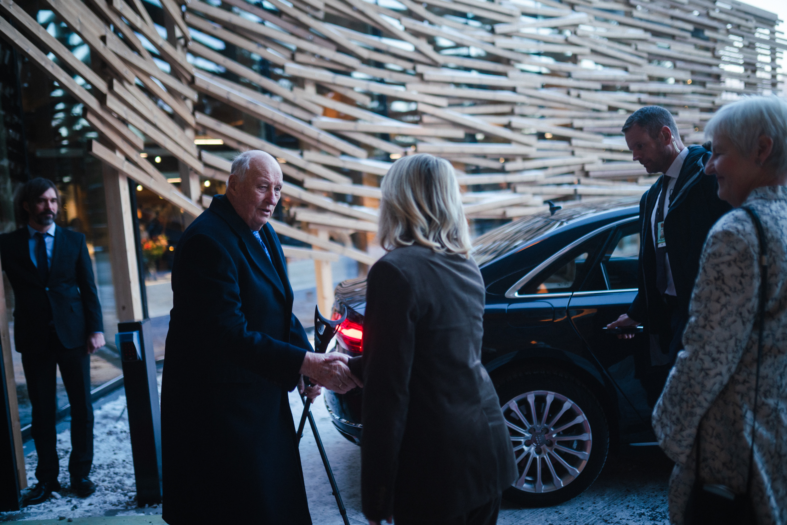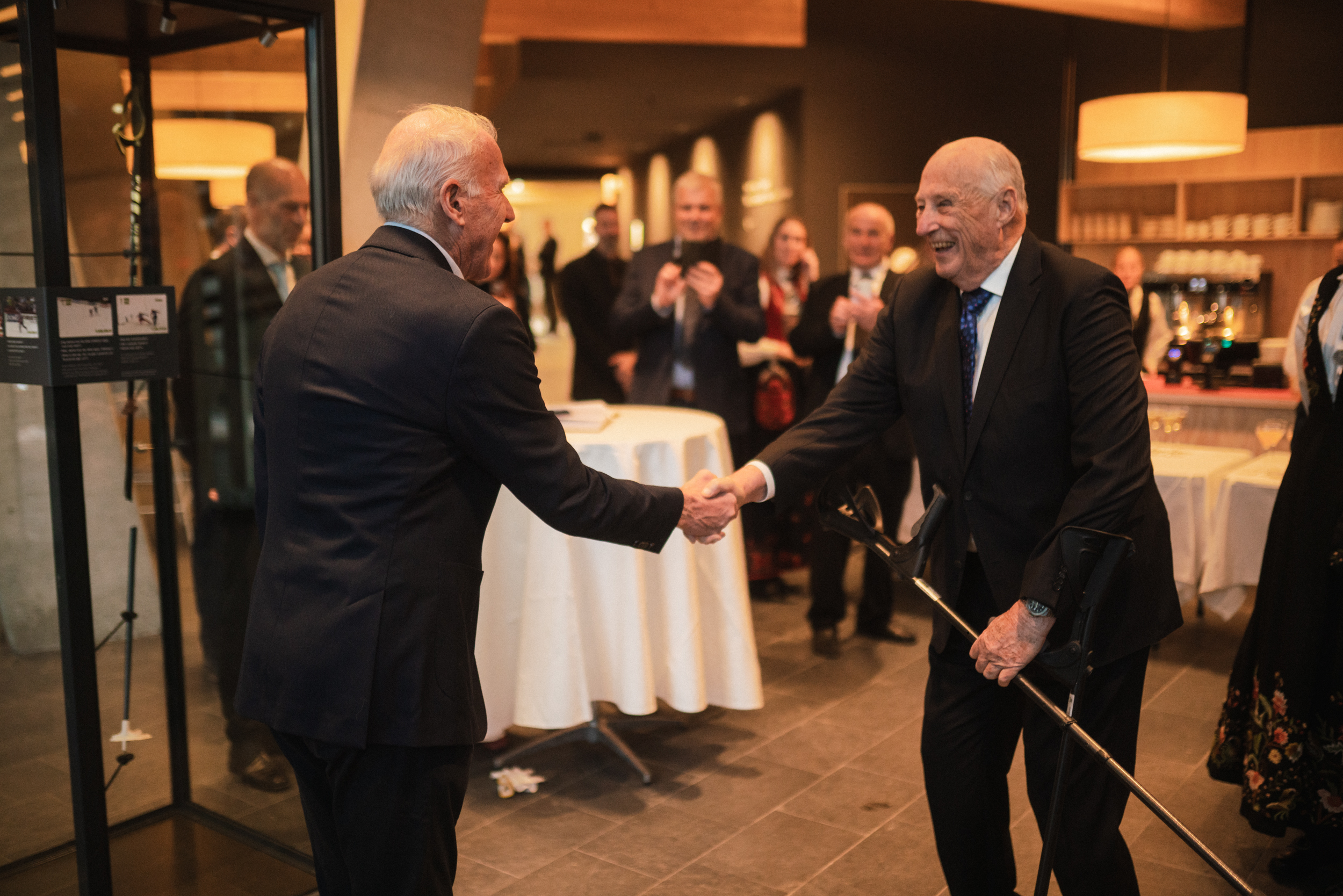 Norges skiinteresserte konge fikk en lang prat med Oddvar Brå, som er glad for at staven nå er der den hører hjemme: På Skimuseet.
