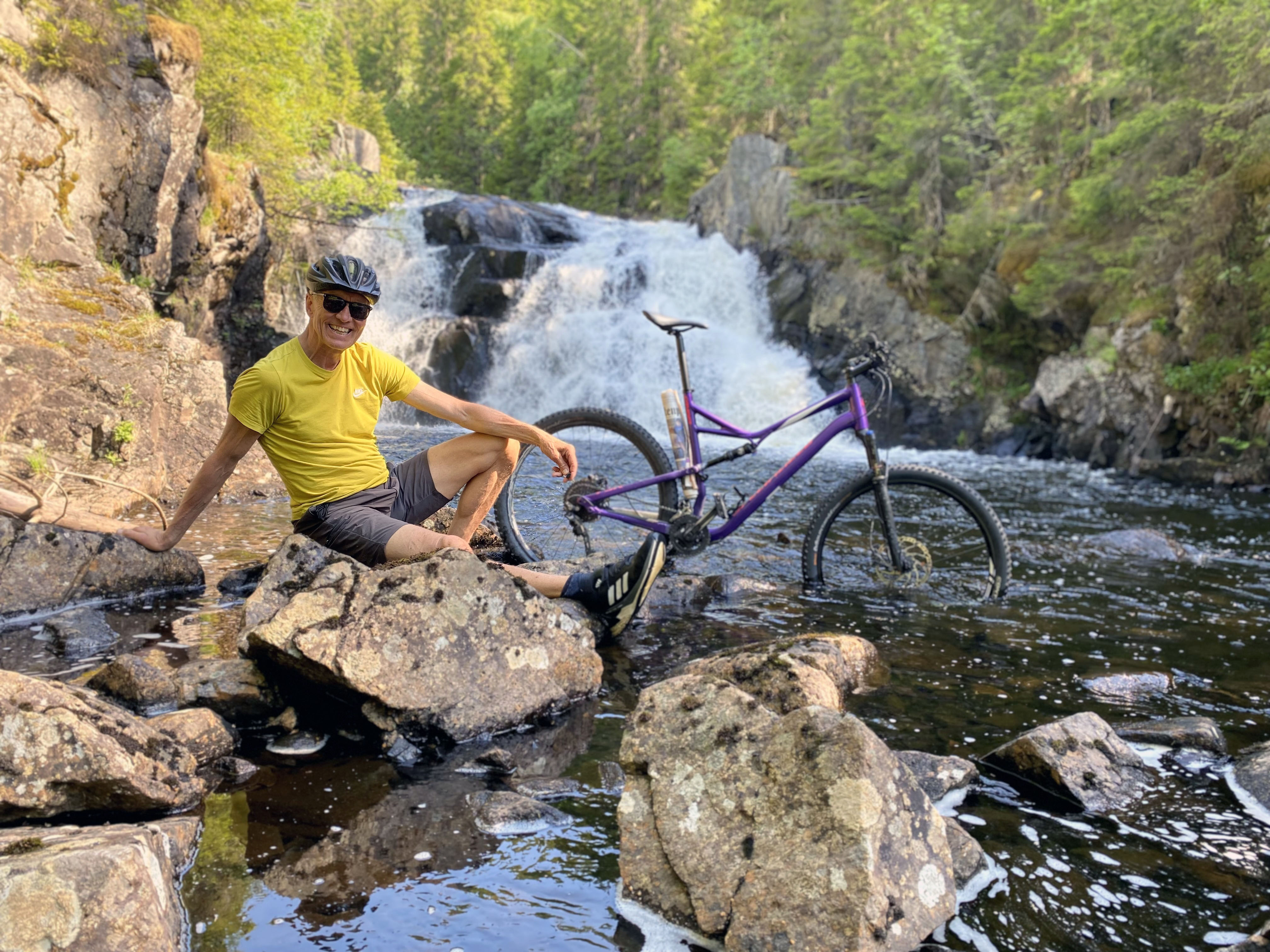 – Jeg tok med meg sykkelen på stien og ned til fossen, men de siste femti meterne ned til fossen på umerket sti er nok bedre uten sykkel. Om du ikke vil ta årets mest spesielle sykkelvaskbilde, da.