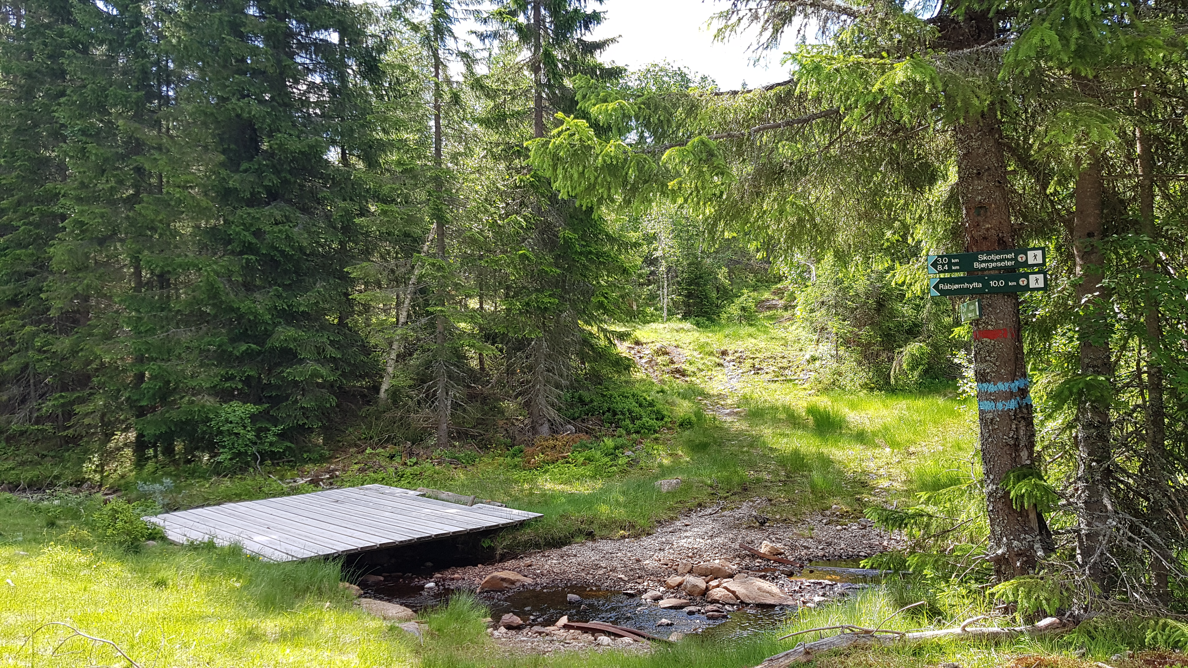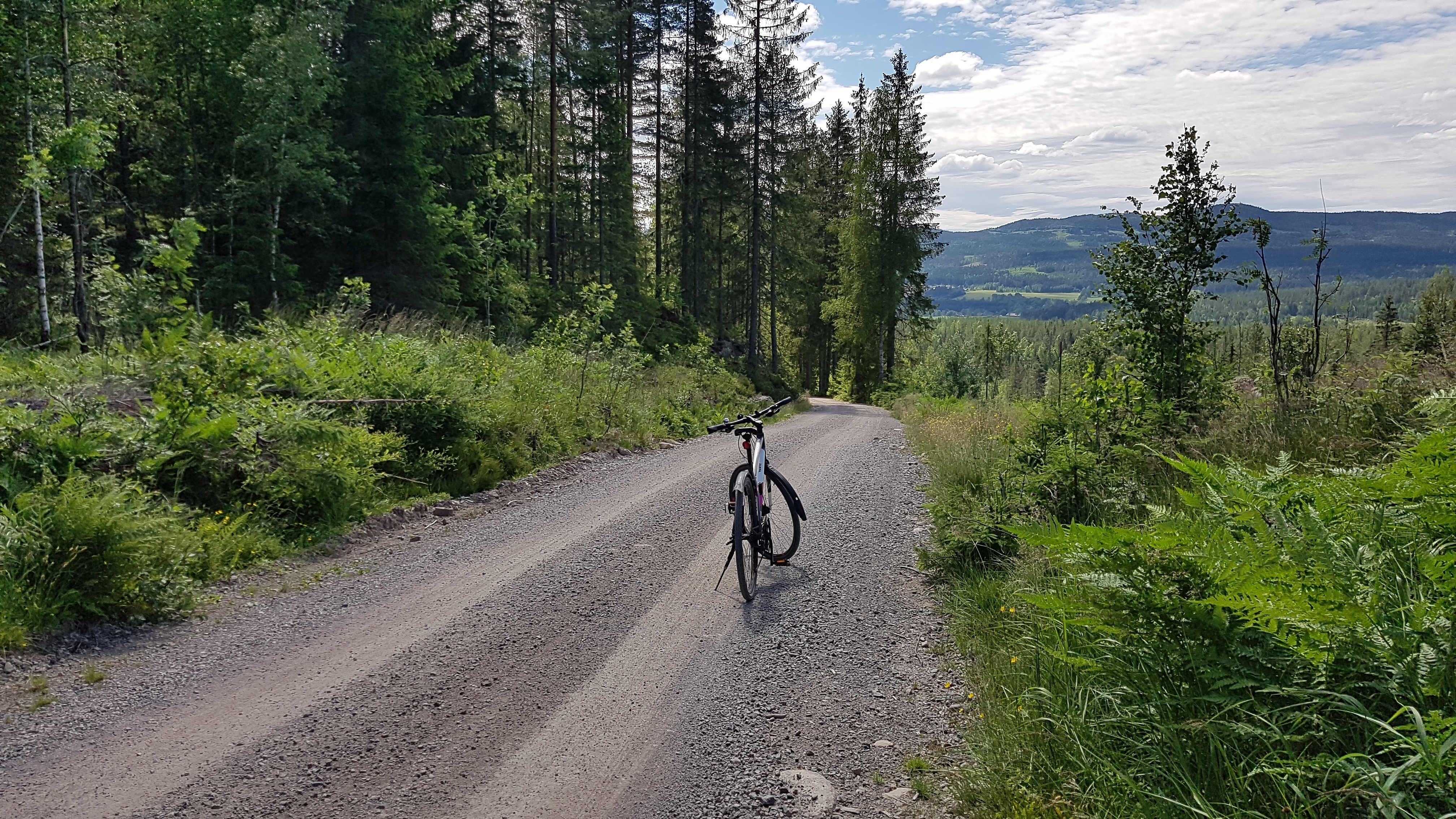 Ved Råsjøen hilser vi på Skiforeningens løypebas, som er ute i skogen for å lage en ny skiløype sør/sørvest for vannet. Råsjøen har skumle isforhold og den nye løypen er derfor et kjærkommet bidrag for å gi et trygt alternativ rundt vannet. Akkurat nå føles det veldig lenge igjen til vinteren, og vi nyter av sommeren og blå himmel da vi sykler videre.
