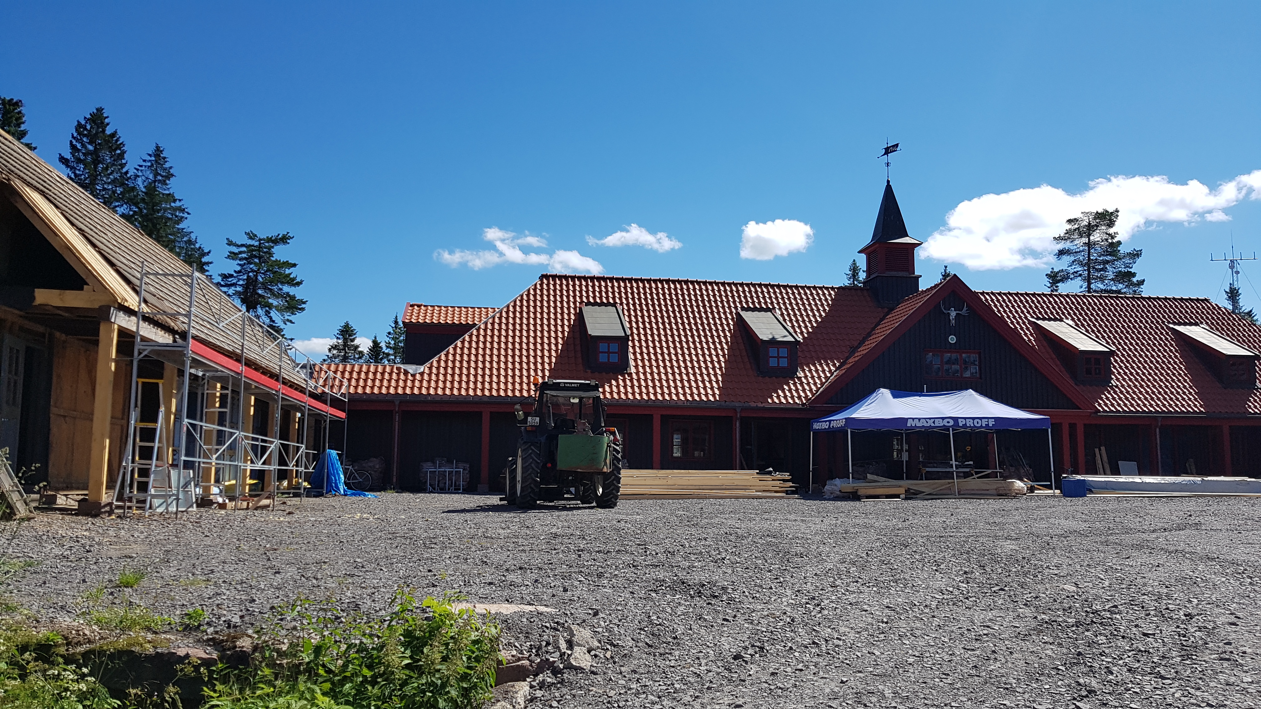 UNDER RENOVERING. Jaktslottet renoveres i disse dager. Visste du forresten at Råsjøskog var en viktig arbeidsplass og et eget lite samfunn med seter, sagbruk, smie, egen kraftstasjon, skogshusvær og stall? Foto: Lisa Näsholm