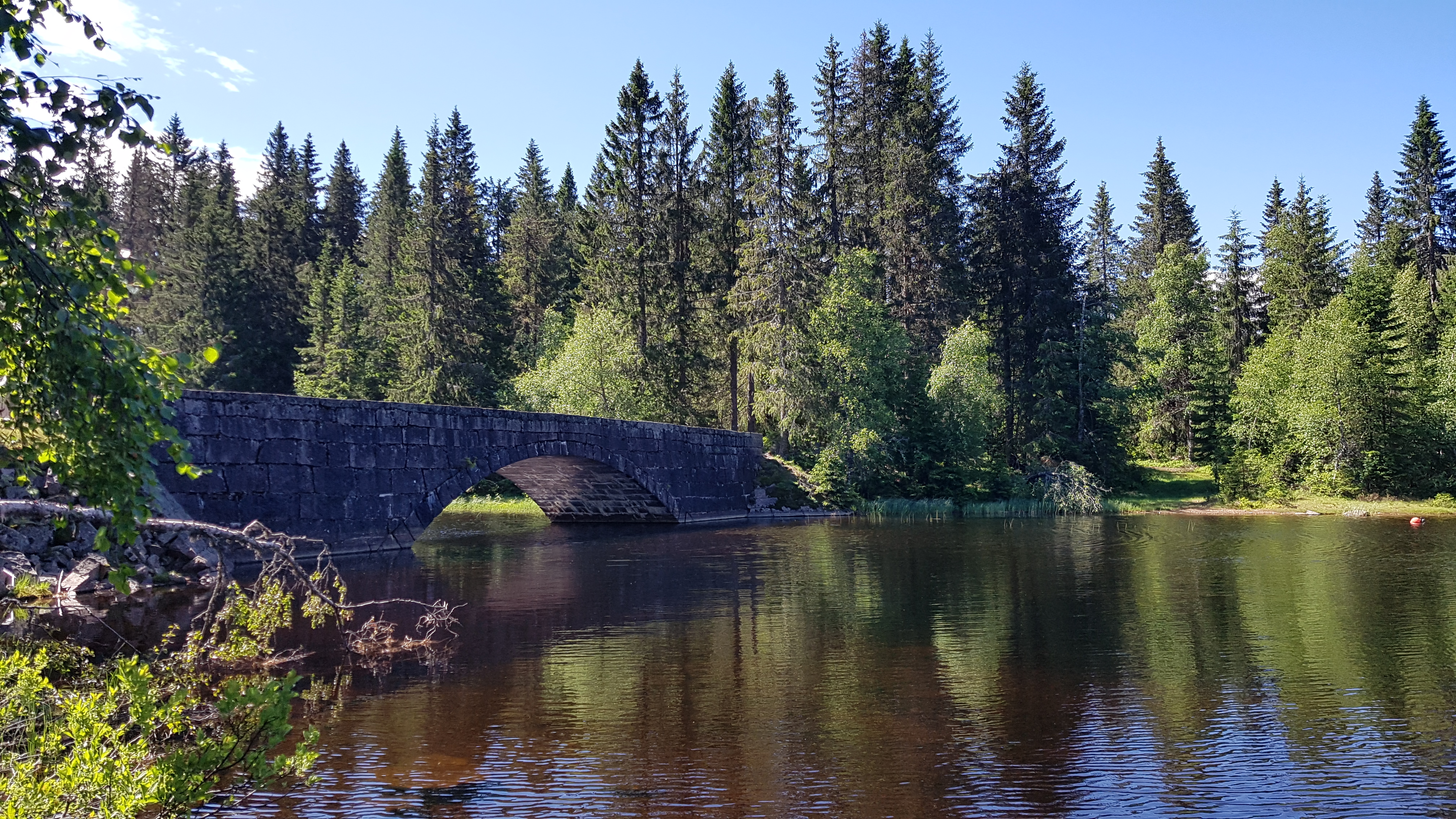 VEIEN MOT SLOTTET: Vi krysser den vakre steinbroen på vei mot jaktslottet, Råsjøen, fra begynnelsen av 1900-tallet. Historisk sus rasler i trærne. Foto: Lisa Näsholm
