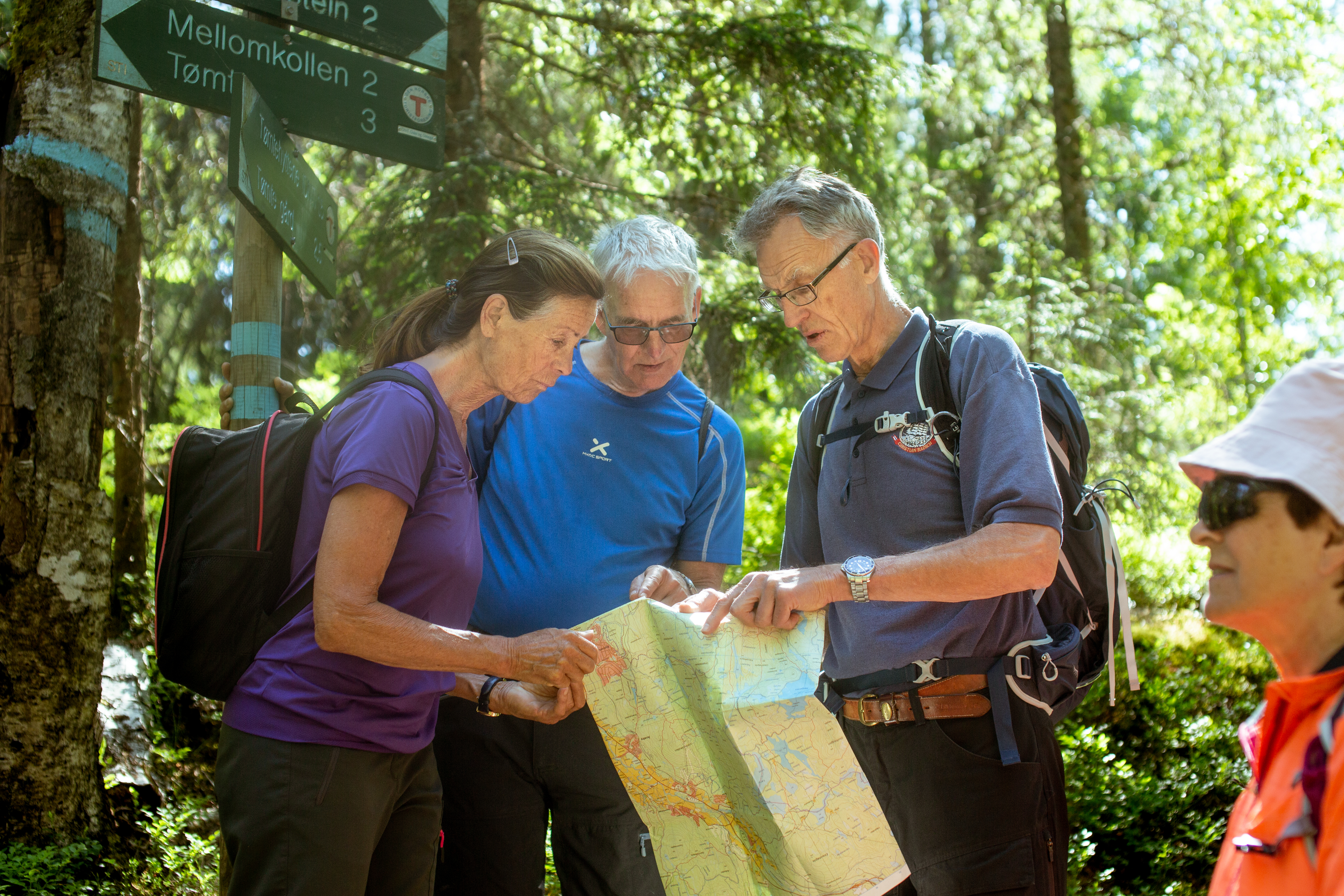 Turledere: Stien opp til Mellomkollen er godt merket, men det er alltid gøy å følge med på kartet. Turlederne viser og forklarer hvor turen skal gå.