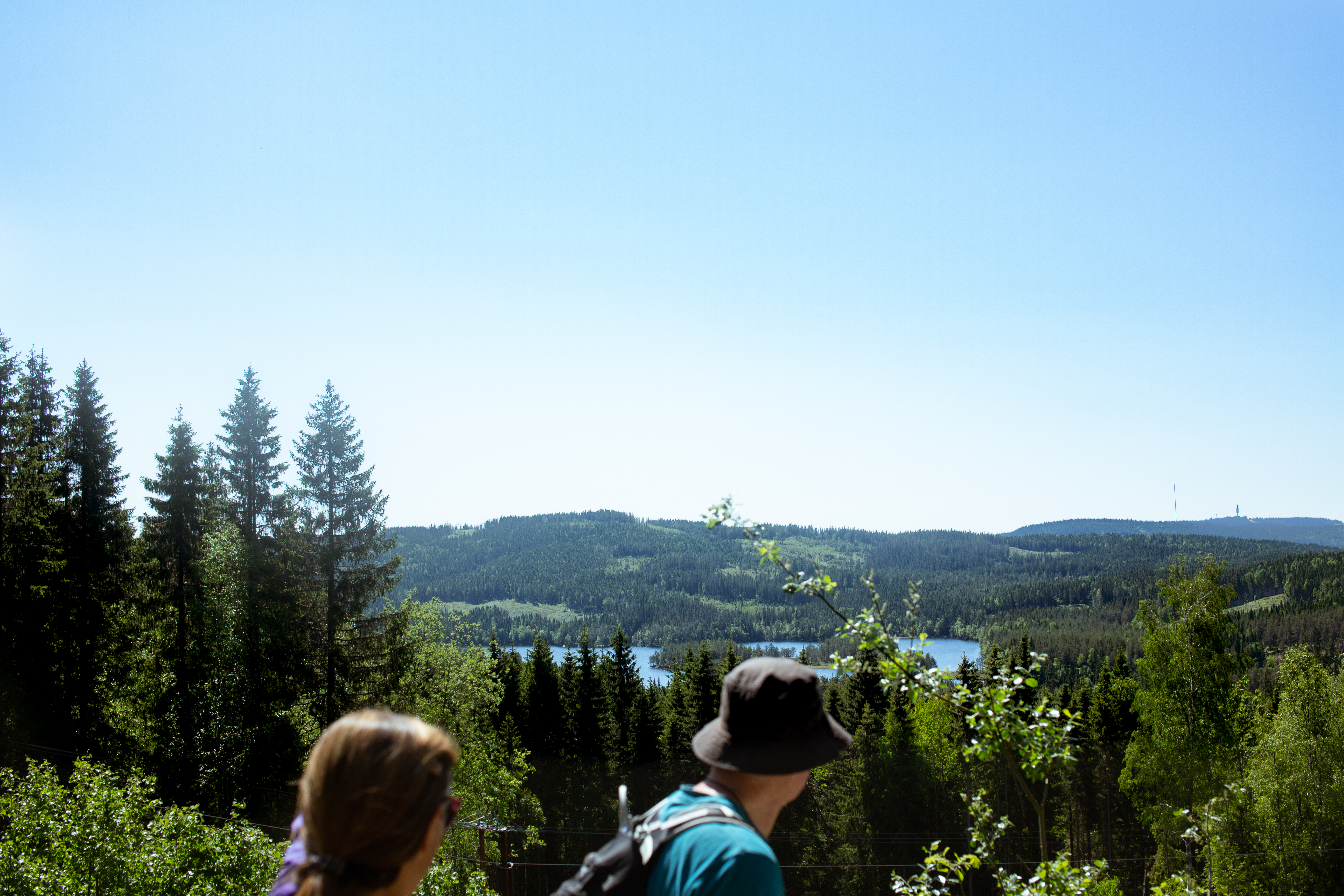 Da vi kommer på toppen av åstoppen følger vi avstikkeren ut mot utsiktspunktet. Her nyter vi lunsjen med nydelig utsikt over Maridalsvannet og Oslofjorden i det fjerne. Vi skal ikke gå samme vei tilbake og følger stien videre mot Tømte. Nå går det raskt nedover. Etter en stund kommer vi forbi Tømte gård. Gården har vært fraflyttet siden 1980-tallet og brukes nå som fritidsbolig. Vi fortsetter nedover mot Øyungen og passerer også gården Liggeren.