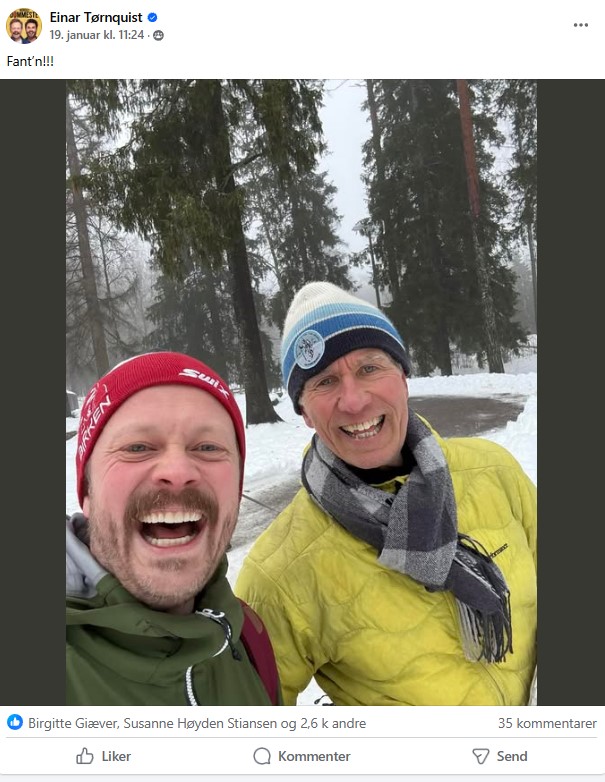 – Det er utrolig hyggelige folk der ute. De du møter langt inni skogen en tidlig morgen, dét er blide folk, det! Det finnes ingen verdensproblemer i Marka. Jeg ser mange pensjonister og folk som er i samme bransje som meg. Ingerid Stenvold, Emil Gukild, sånne typer. De går så fort at jeg kun ser dem når de kommer som møtende trafikk. I Marka kan jeg bli veldig kaklete. Jeg blir så lett til sinns og hører meg selv slenge ut meldinger. “Jaja! Ute og går?”. Folk har lav terskel for å spørre hverandre om ting. Det er noe med dette lettsindige fellesskapet. Vi koser oss!