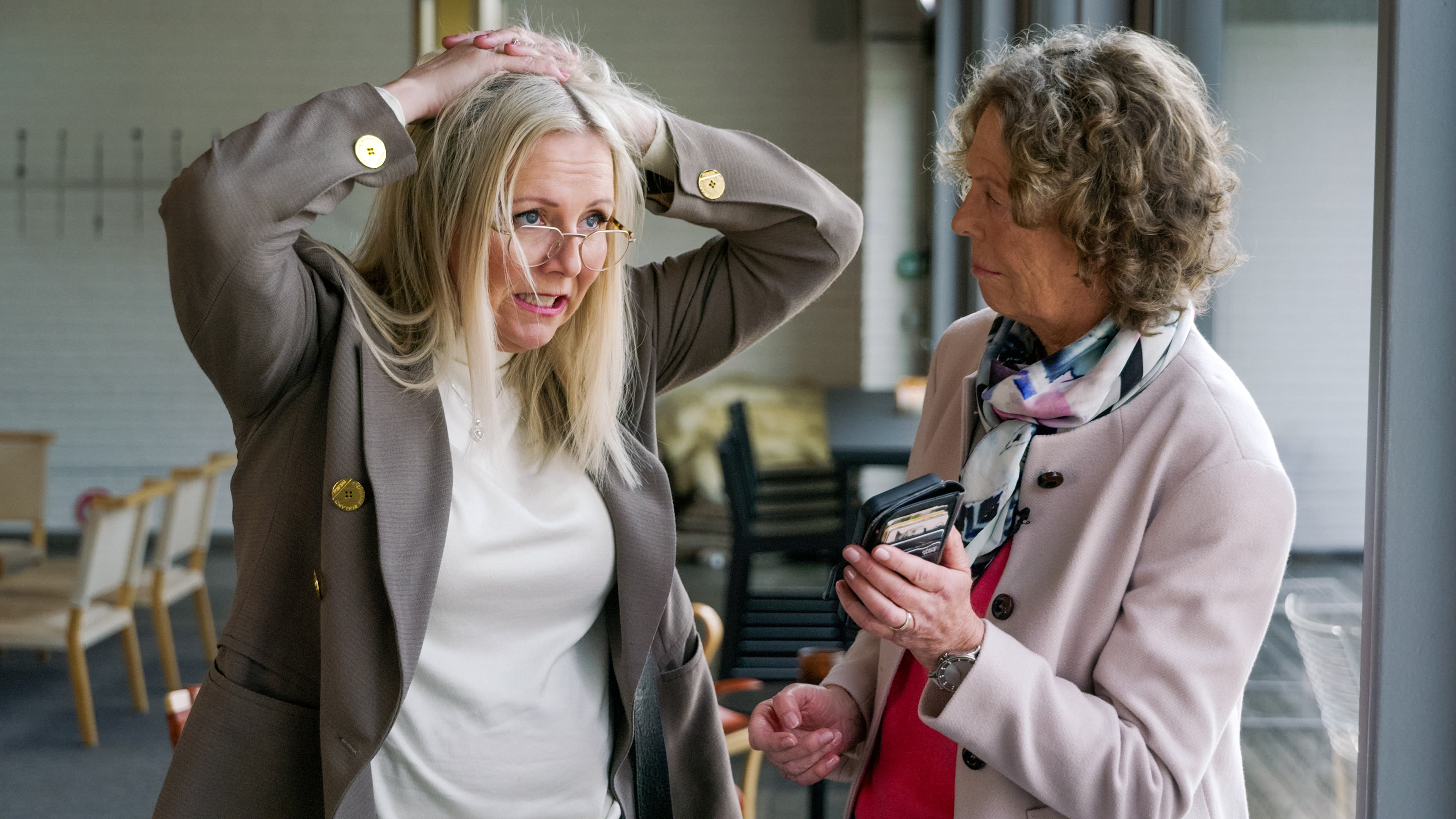 Mas for manager: Kristin Tonjer spiller manager Evelyn. En tung oppgave, når rollefiguren Linn Skåber ikke får det helt til i rollen som Kristin Kirkemo. Foto: NRK.