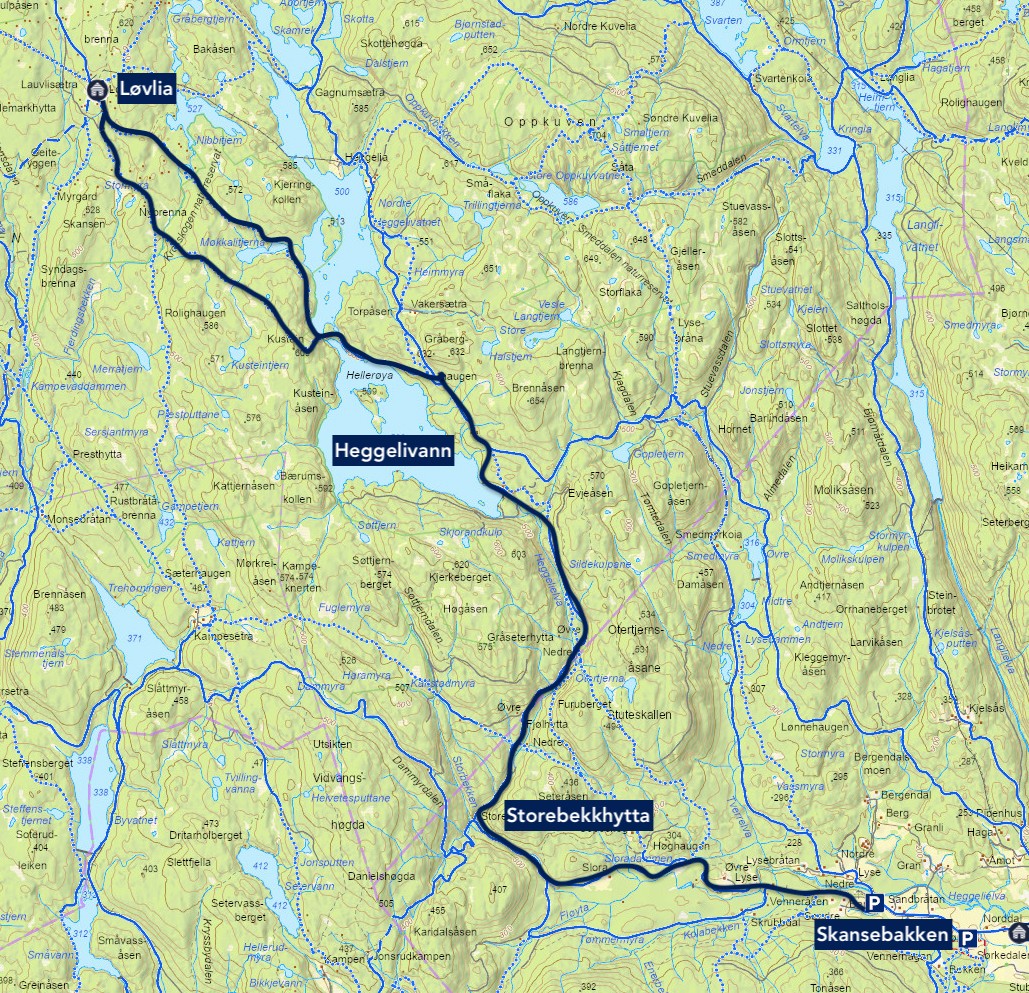 🌲Følg blåmerket sti til fots til Løvlia, cirka 4 km fra Heggelivann.